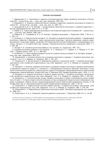 1. Даведьянова Н. С. Становление и развитие естественнонаучной теории семейного воспитания в России, конец XIX - начало XX вв.: дис. … канд. пед. наук. Владимир, 1995. 254 с. EDN: NPQOCT