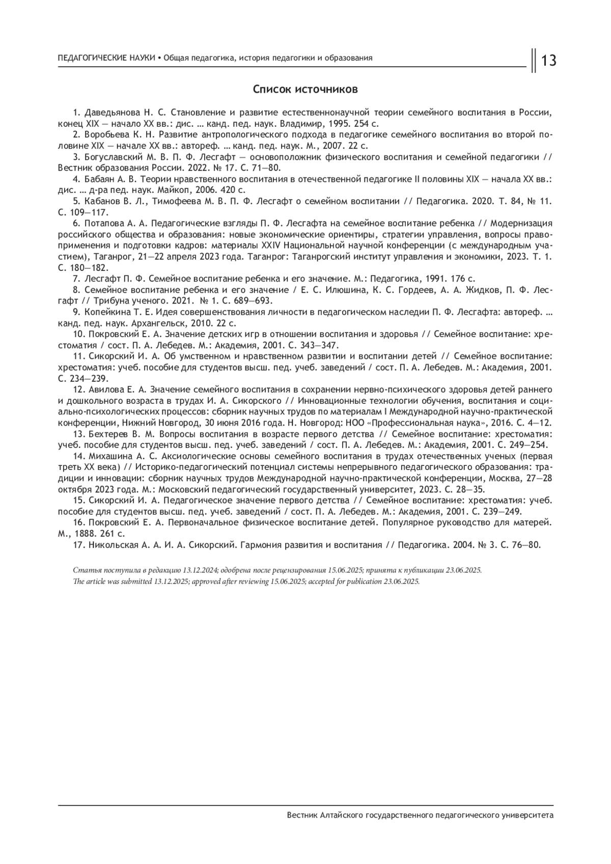 5. Кабанов В. Л., Тимофеева М. В. П. Ф. Лесгафт о семейном воспитании // Педагогика. 2020. Т. 84, № 11. С. 109-117. EDN: IMVUNE