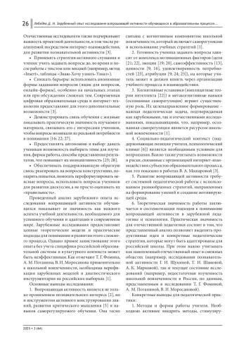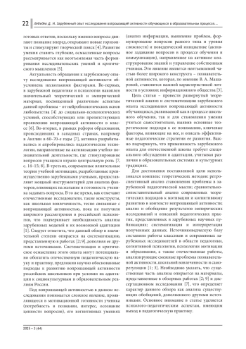 В статье анализируется зарубежный опыт исследования вопрошающей активности обучающихся как значимого аспекта учебной деятельности в современном образовании. Рассмотрена связь этого процесса с критическим мышлением, самообучением, школьной вовлеченностью и метакогнитивными процессами. Систематизированы теоретические подходы (когнитивный, мотивационный, социокультурный) и педагогические стратегии развития активности школьников, включая возможности цифровых образовательных сред. Результаты структурируют зарубежные исследования, предлагая ориентиры для возможного совершенствования отечественной образовательной практики с учетом ее специфики.