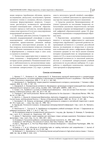 1. Фомина Т. Г., Потанина А. М., Моросанова В. И. Взаимосвязь школьной вовлеченности и саморегуляции учебной деятельности: состояние проблемы и перспективы исследований в России и за рубежом // Вестник РУДН. Серия: Психология и педагогика. 2020. Т. 17, № 3. С. 542-565.