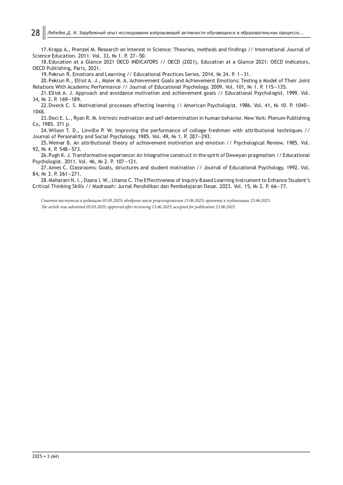 25. Weiner B. An attributional theory of achievement motivation and emotion // Psychological Review. 1985. Vol. 92, № 4. P. 548-573.