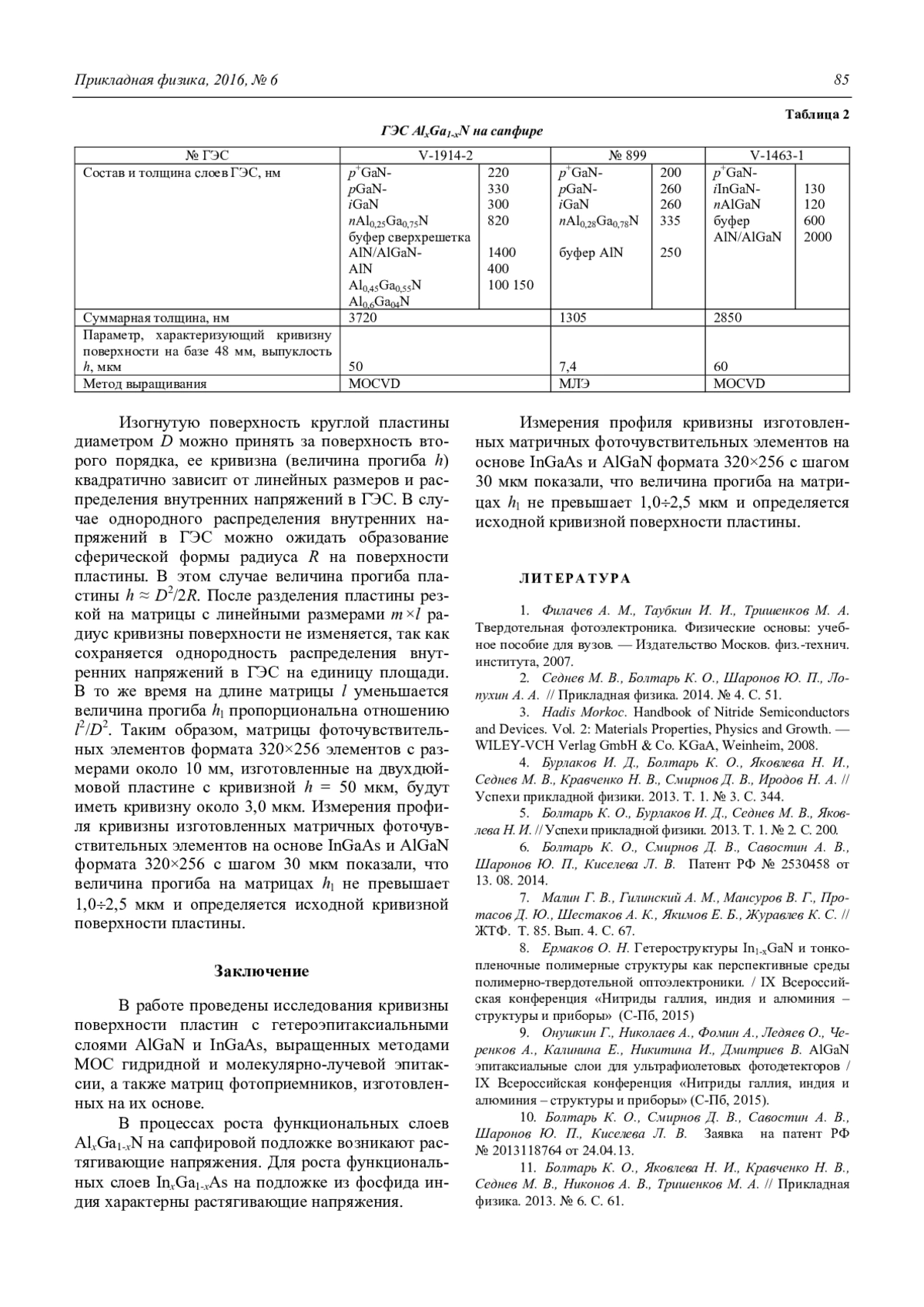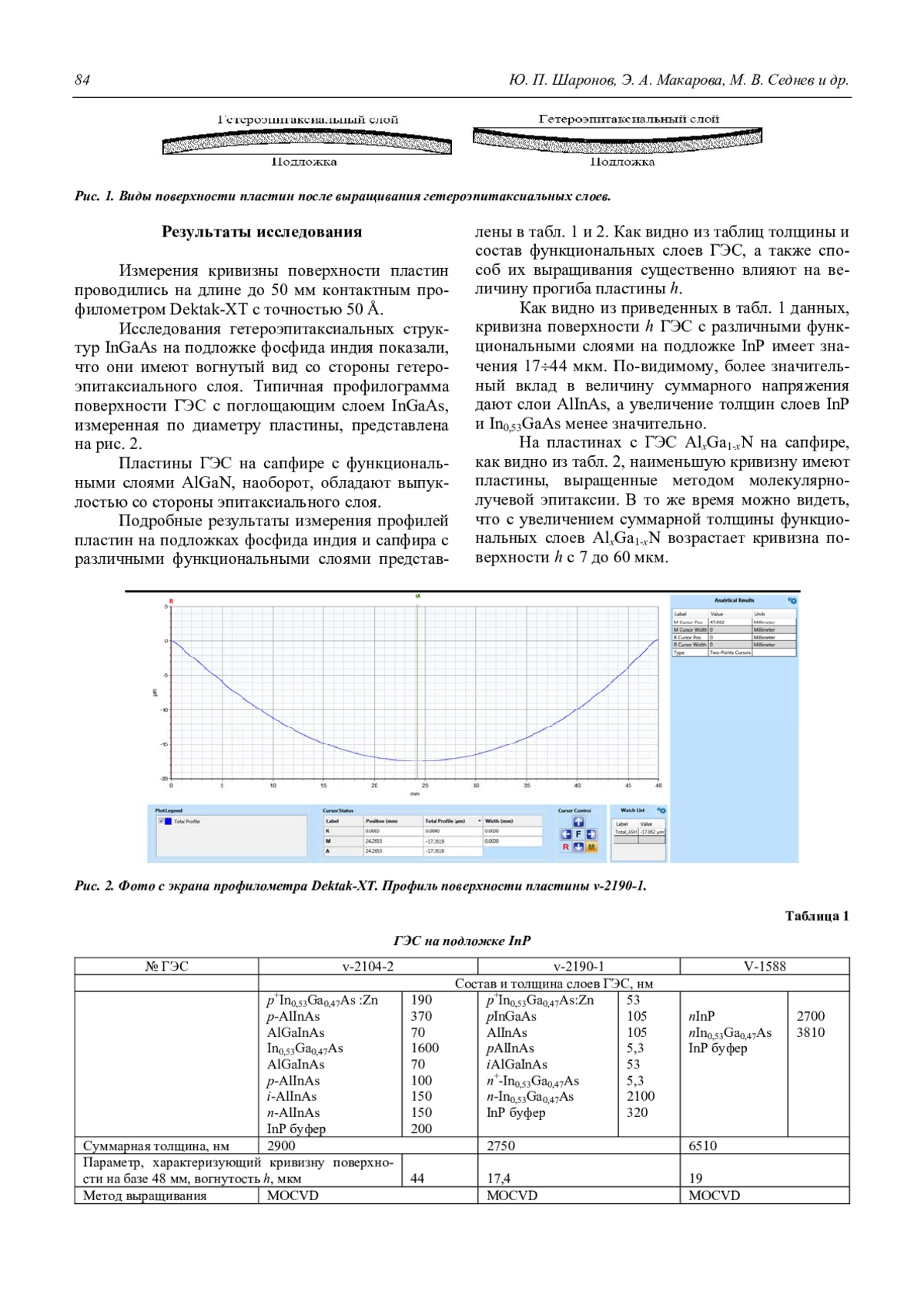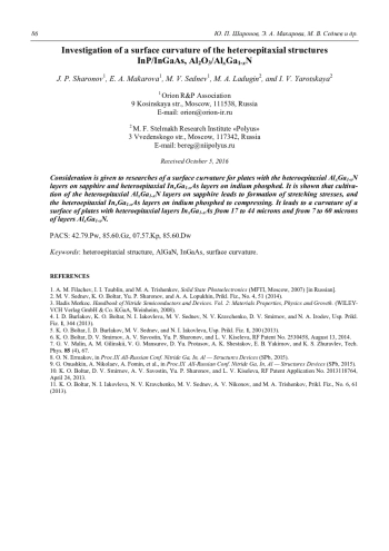 Шаронов Ю. П., Макарова Э. А., Седнев М. В., Ладугин М. А., Яроцкая И. В. Исследование кривизны поверхности гетероэпи-таксиальных структур InP/InGaAs, Al2O3/AlxGa1-xN 83