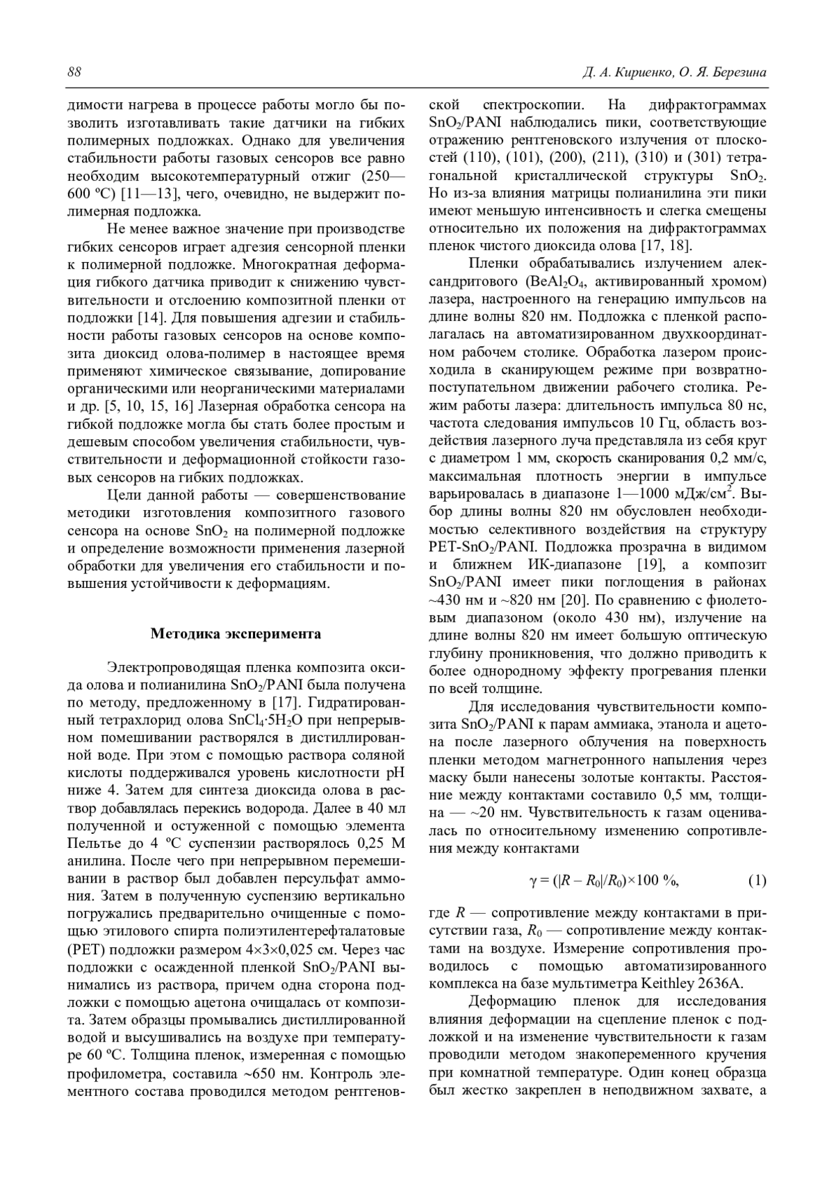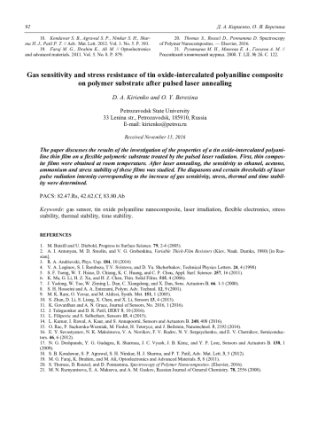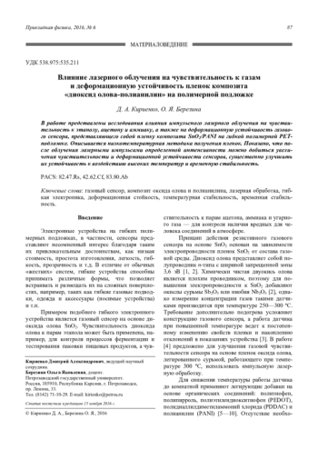 Кириенко Д. А., Березина О. Я. Влияние лазерного облучения на чувствительность к газам и деформационную устойчивость пленок композита «диоксид олова-полианилин» на полимерной подложке 87