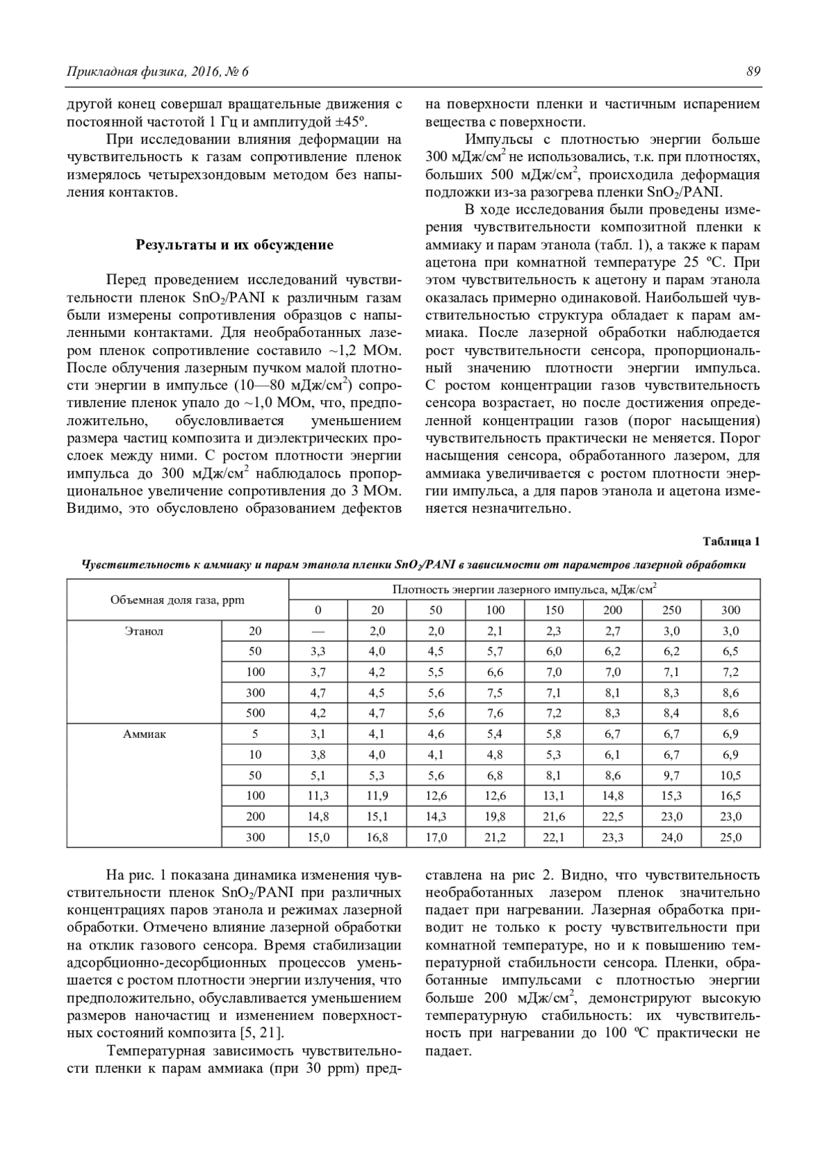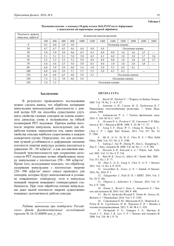 В результате проведенного исследования можно сделать вывод, что обработка лазерными импульсами наносекундной длительности с длиной волны 820 нм способна существенно улучшить свойства газовых сенсоров на основе композита диоксида олова и полианилина на гибкой полимерной PEТ подложке. Причем выбор плотности энергии импульсов, используемых для обработки пленки, определяется тем, какие именно свойства сенсора наиболее существенны в каждом конкретном случае. Определено, что для достижения лучшей устойчивости к деформации значения плотности энергии импульса должны находиться в диапазоне 30—50 мДж/см2, а для достижения наибольшей чувствительности при сохранении целостности PET подложки лучше обрабатывать пленку импульсами с плотностью 250—300 мДж/см2. Кроме того, исследование показало, что обработку лазерными импульсами с плотностью энергии 250—300 мДж/см2 имеет смысл проводить для сенсоров, которые будут использоваться в условиях повышенных температур, хотя и импульсы меньшей энергии повышают температурную стабильность. При этом обработка пленки импульсами даже малой плотности энергии существенно повышает долговечность работы сенсора.