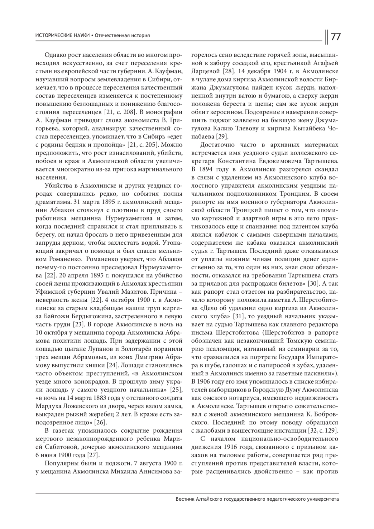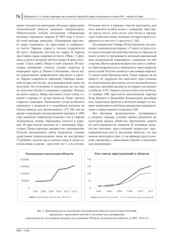 В статье рассмотрены особенности пенитенциарной системы и систематизированы акмолинские бытовые преступления. Через эти категории девиация рассмотрена как элемент пространства повседневности; особенности преступлений Акмолинска в конце XIX - начале XX века выступают в качестве маркеров городской среды. В статье приводятся архивные материалы из Государственного архива Акмолинской области (ГААО) и Центрального государственного архива Республики Казахстан (ЦГА РК). Встречающийся в цитируемых источниках этноним «киргизы» соответствует современному этнониму «казахи».