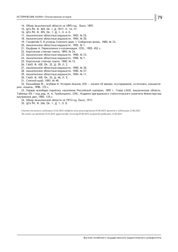 33. Первая всеобщая перепись населения Российской империи, 1897 г. Глава LXXXI. Акмолинская область. Таблица XIV / под ред. Н. А. Тройницкого. СПб.: Издание Центрального статистического комитета Министерства внутренних дел, 1905. 135 с.