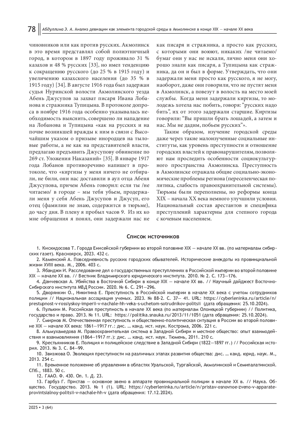 9. Крестьянников Е. Полиция и полицейское следствие в Западной Сибири (1822-1897 гг.) // Российская история. 2013. № 3. С. 84-99.