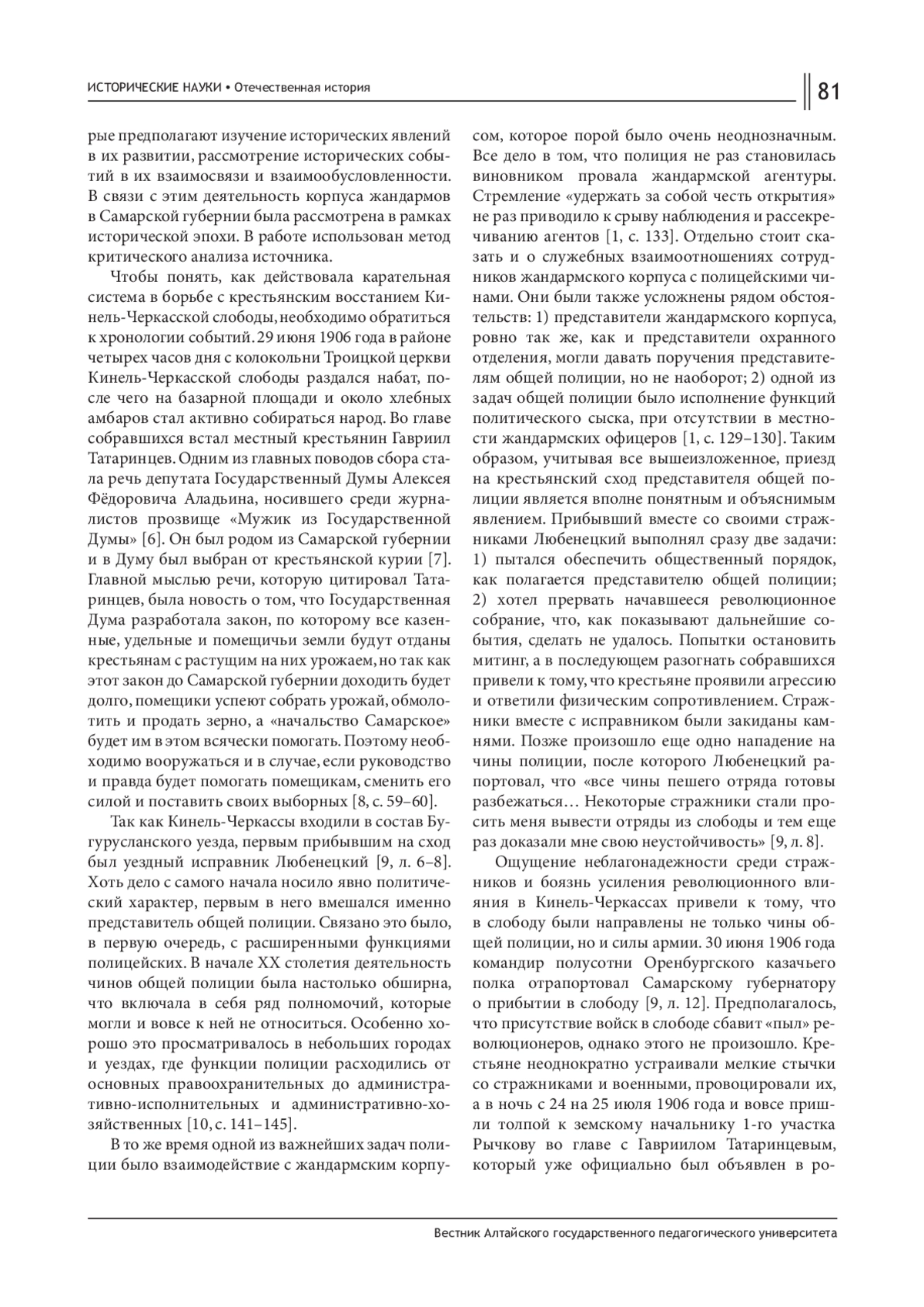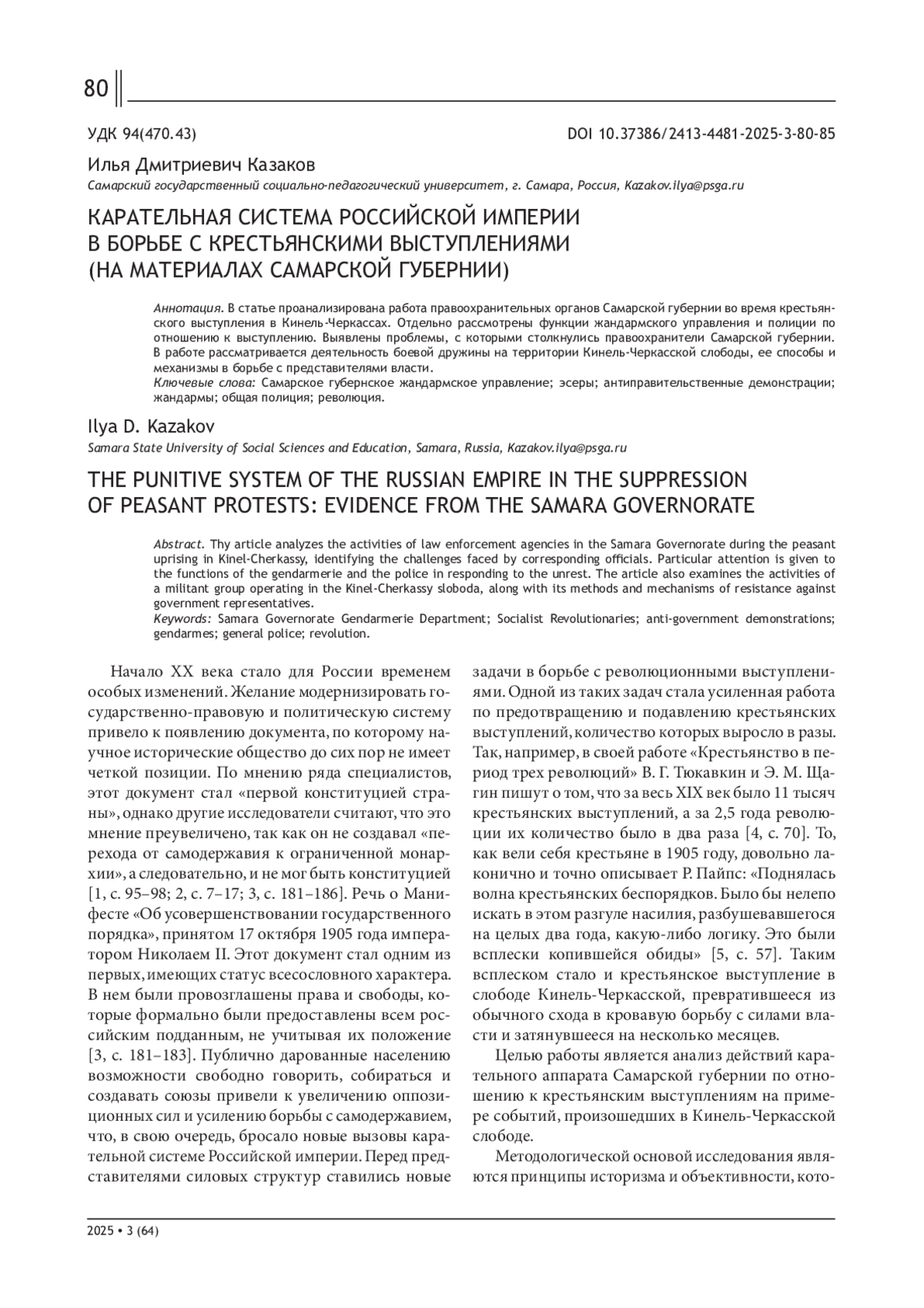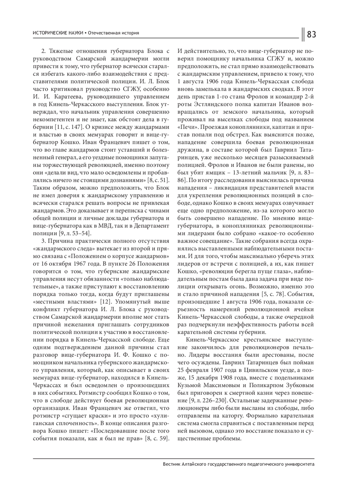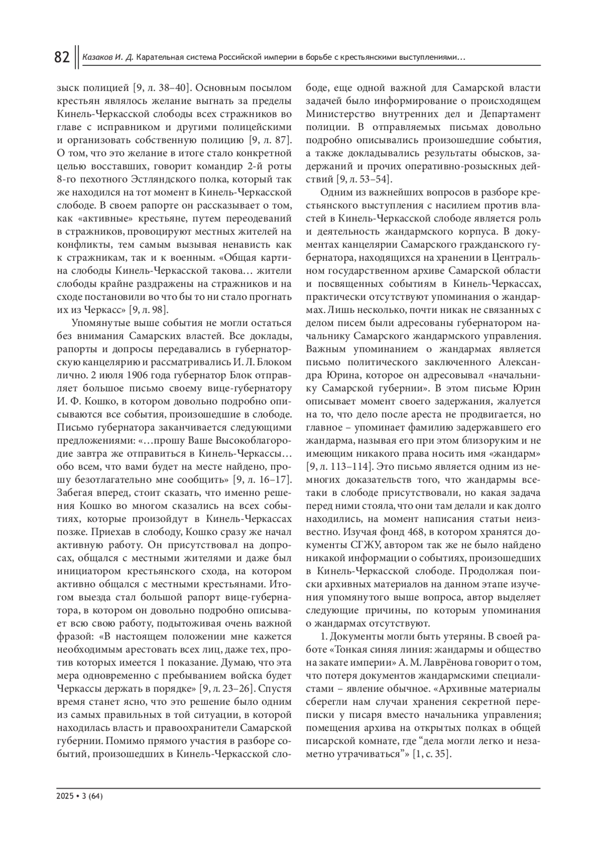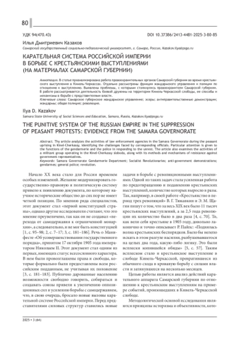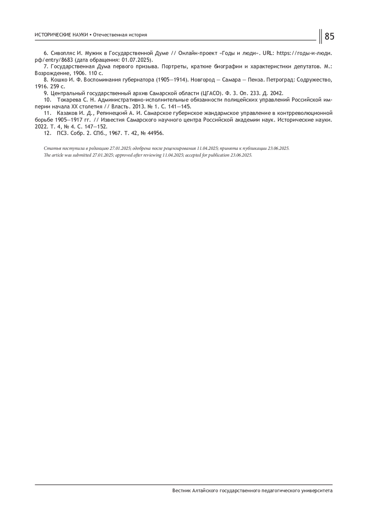 11. Казаков И. Д., Репинецкий А. И. Самарское губернское жандармское управление в контрреволюционной борьбе 1905-1917 гг. // Известия Самарского научного центра Российской академии наук. Исторические науки. 2022. Т. 4, № 4. С. 147-152. EDN: YJEDTK