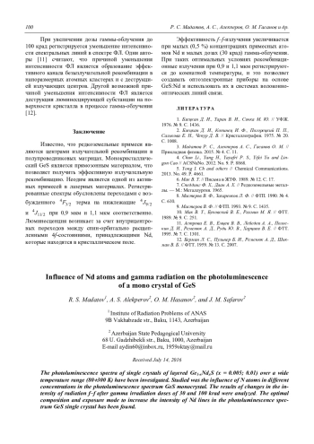 R. S. Madatov, A. S. Alekperov, O. M. Hasanov, and J. M. Safarov Influence of Nd atoms and gamma radiation on the photolumi-nescence of a mono crystal of GeS 97