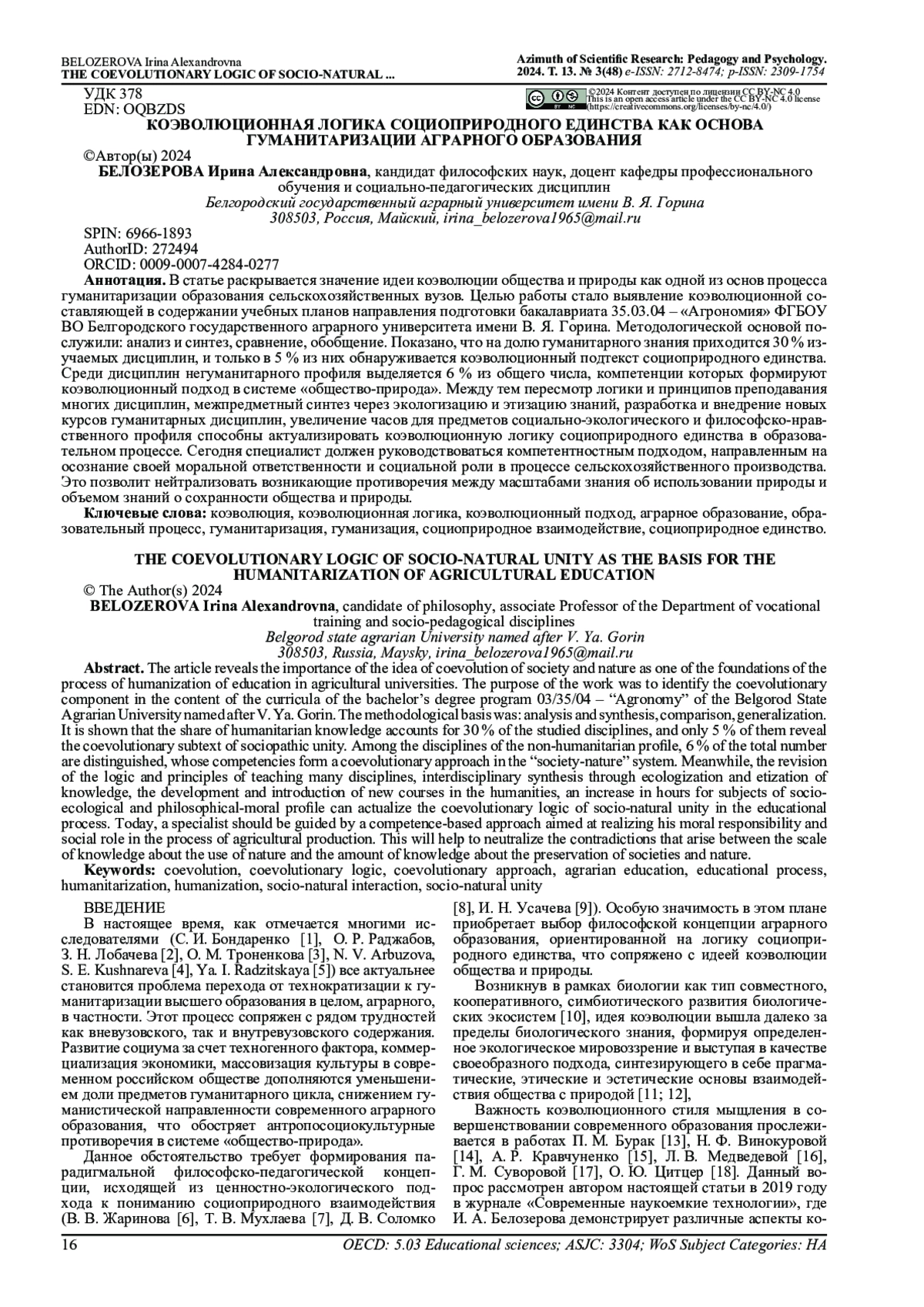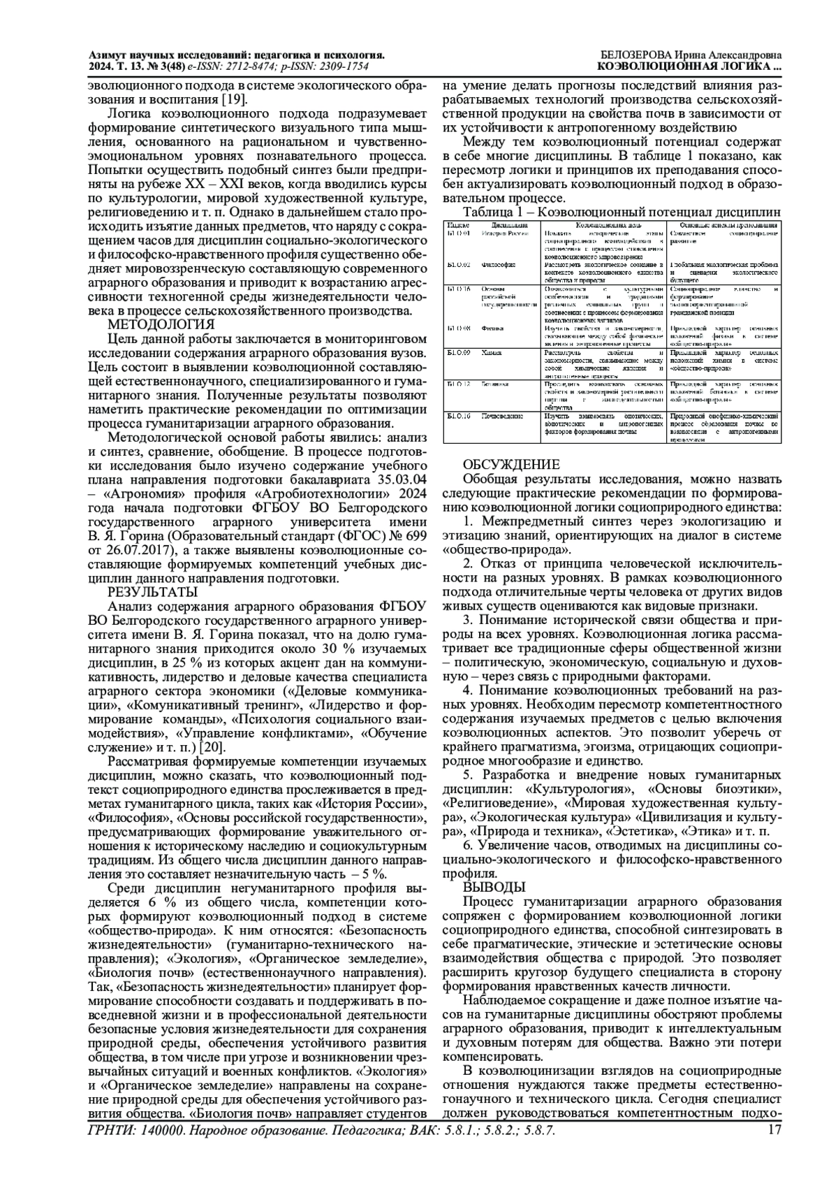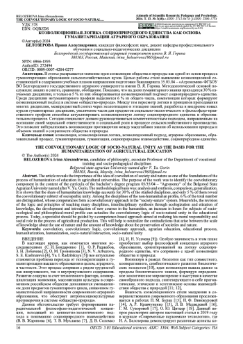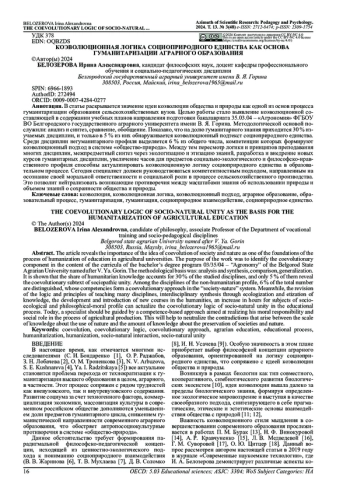 Целью работы стало выявление коэволюционной составляющей в содержании учебных планов направления подготовки бакалавриата 35.03.04 - «Агрономия» ФГБОУ ВО Белгородского государственного аграрного университета имени В. Я. Горина. Методологической основой послужили: анализ и синтез, сравнение, обобщение. Показано, что на долю гуманитарного знания приходится 30 % изучаемых дисциплин, и только в 5 % из них обнаруживается коэволюционный подтекст социоприродного единства. Среди дисциплин негуманитарного профиля выделяется 6 % из общего числа, компетенции которых формируют коэволюционный подход в системе «общество-природа». Между тем пересмотр логики и принципов преподавания многих дисциплин, межпредметный синтез через экологизацию и этизацию знаний, разработка и внедрение новых курсов гуманитарных дисциплин, увеличение часов для предметов социально-экологического и философско-нравственного профиля способны актуализировать коэволюционную логику социоприродного единства в образовательном процессе. Сегодня специалист должен руководствоваться компетентностным подходом, направленным на осознание своей моральной ответственности и социальной роли в процессе сельскохозяйственного производства. Это позволит нейтрализовать возникающие противоречия между масштабами знания об использовании природы и объемом знаний о сохранности общества и природы.