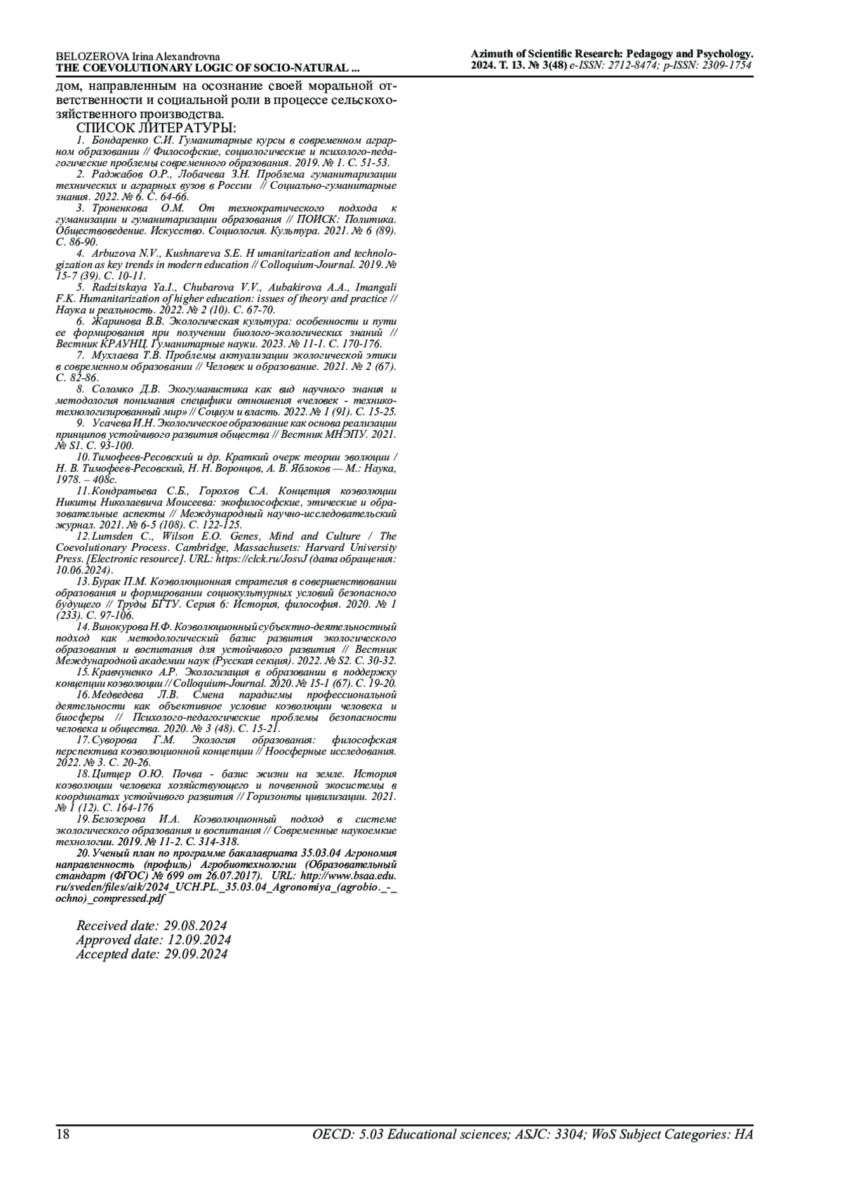 19. Белозерова И.А. Коэволюционный подход в системе экологического образования и воспитания // Современные наукоемкие технологии. 2019. № 11-2. С. 314-318. EDN: CKFTER