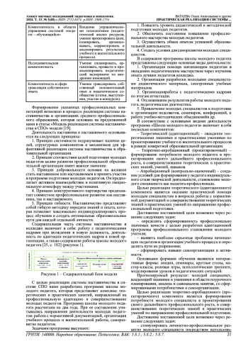 В настоящее время отмечается постоянное повышение требований как к профессиональным, так и к личным качествам молодого педагога. Ежедневно они сталкиваются с неуверенностью в себе и своих силах, трудностями в общении с подопечными и их родителями, недостатком времени, поскольку подготовка к занятиям весьма трудоемкая, невысокой оплатой труда и, как следствие, со стрессами и профессиональным выгоранием. Кроме того, для успешной профессиональной самореализации молодому специалисту предстоит овладеть целым рядом профессиональных компетентностей, чтобы грамотно управлять образовательным процессом. Это привело к тому, что сегодня кадровый голод ощущается на всех уровнях системы образования в России. Одним из эффективных направлений работы с молодыми педагогами является система наставничества. Именно наставник помогает развивать профессиональные компетенции, делится накопленным опытом и оказывает помощь в адаптации и профессиональном становлении своего молодого коллеги. Настоящая статья является продолжением работы, ранее опубликованной в данном журнале, и представляет практическую реализацию модели наставничества в системе среднего профессионального образования. В статье представлены принципы деятельности наставника и наставляемого, содержательная часть системы наставничества в колледже, которая включает в себя: работу с педагогическими кадрами при вхождении в новую должность, деятельность по адаптации педагогических кадров в новой организации, а также содержание работы школы молодого педагога. С целью реализации системы наставничества в системе СПО нами разработана программа «Школа молодого педагога», которая представляет комплекс теоретических и практических занятий, направленный на профессиональную адаптацию и совершенствование молодых педагогов. При ее составлении учитывались направления их деятельности: работа с нормативной документацией, организация учебного процесса, организация воспитательной работы, саморазвитие педагогов. В соответствии с основными видами деятельности программа включает в себя несколько компонентов: теоретический (адаптационный), теоретико-апробационный (проектировочный), апробационный (контрольно-оценочный). В статье также описано содержание школы молодого педагога согласно календарно-тематическому плану. Организация наставничества в процессе повышения профессиональной компетентности молодого педагога носит поэтапный характер и включает в себя формирование и развитие функциональных и личностных компонентов деятельности начинающего педагога.