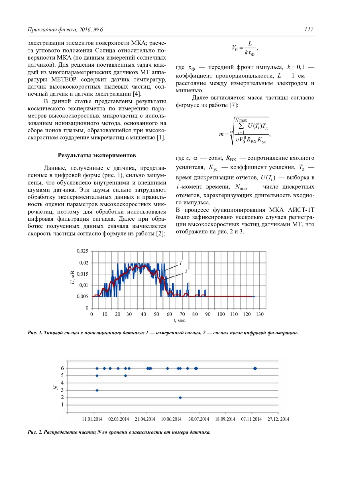 Разработанные датчики МТ позволили зарегистрировать параметры мирометеороидов и частиц космического мусора на околоземной орбите. Ионизационный метод является одним из самых чувствительных методов измерения [8], но также обладает и повышенной чувствительностью к внешним шумам. Использование одного метода измерения для оценки параметров микрометороидов и частиц космического мусора возможно, но затрудняет интерпретацию полученных данных. В связи с этим рекомендуется для датчиков высокоскоростных микрочастиц использовать комбинированные методы для однозначной регистрации микрометеороидов.