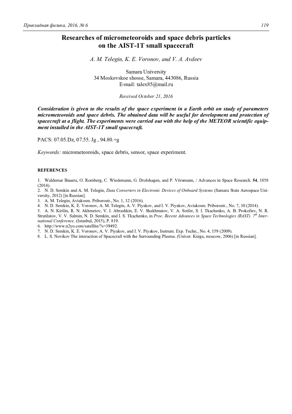 A. M. Telegin, K. E. Voronov, and V. A. Avdeev Researches of micrometeoroids and space debris particles on the AIST-1T small spacecraft 116