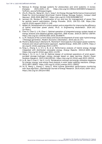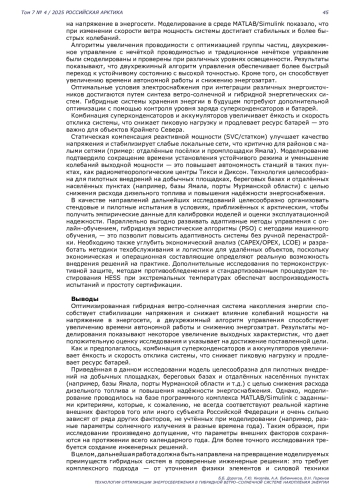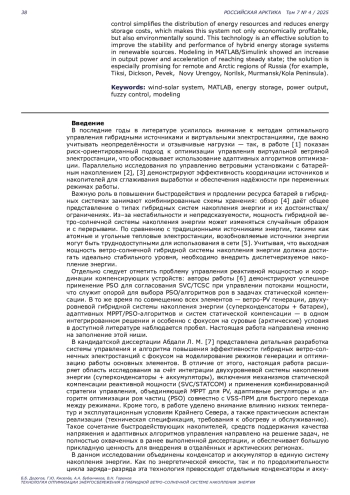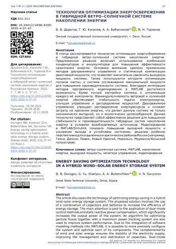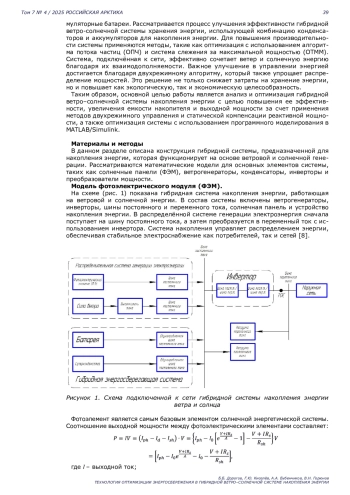 В статье рассматривается технология оптимизации энергосбережения в гибридной ветро–солнечной системе накопления энергии. Предложенное решение включает использование комбинации конденсаторов и аккумуляторов для повышения эффективности накопления энергии. Основное внимание уделено применению методов двухрежимного управления и статической компенсации реактивной мощности, что позволяет значительно увеличить выходную мощность системы. Также используются алгоритм оптимизации потоков частиц и система отслеживания максимальной мощности для повышения производительности системы. Благодаря интеграции методов программного моделирования в MATLAB достигается возможность более точной настройки системы и оптимизации каждого её компонента. Взаимодополняемость ветровой и солнечной энергий обеспечивает стабильность подачи электроэнергии, улучшая управление и распределение мощностей. Двухрежимное управление упрощает распределение энергоресурсов и снижает затраты на хранение энергии, что делает данную систему не только экономически выгодной, но и экологически целесообразной. Данная технология представляет собой эффективное решение для повышения стабильности и производительности гибридных систем накопления энергии в условиях возобновляемых источников. Моделирование в MATLAB/Simulink показало повышение выходной мощности и ускорение выхода в устойчивое состояние; решение особенно перспективно для отдалённых и арктических районов России (например, Тикси, Диксон, Певек, Новый Уренгой, Норильск, Мурманск/Кольский полуостров).