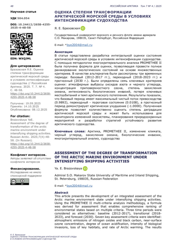 В статье представлена разработка интегральной оценки состояния арктической морской среды в условиях интенсификации судоходства. С помощью методологии многокритериального анализа PROMETHEE II была получена формула для оценки, позволяющая провести полное ранжирование экологических состояний на основе множественных критериев. В качестве альтернатив были рассмотрены три временных периода: базовый (2012-2017 гг.), переходный (2018-2023 гг.) и прогнозный (2030 г.). Были определены семь ключевых критериев оценки: атмосферные выбросы оксидов азота и черного углерода, концентрация приповерхностного озона, степень закисления океана, интенсивность биологических инвазий, потеря ключевых местообитаний и темп арктического потепления. Результаты показали, что базовый период имеет максимальный чистый поток превосходства (0.9892), переходный - пороговое состояние (0.0108), а прогнозный период демонстрирует критическое ухудшение (-1.0000). Полученная формула позволяет количественно оценить степень деградации арктической морской среды и может быть использована для мониторинга изменений экосистемы, планирования природоохранных мероприятий и разработки стратегий устойчивого развития арктического судоходства.
