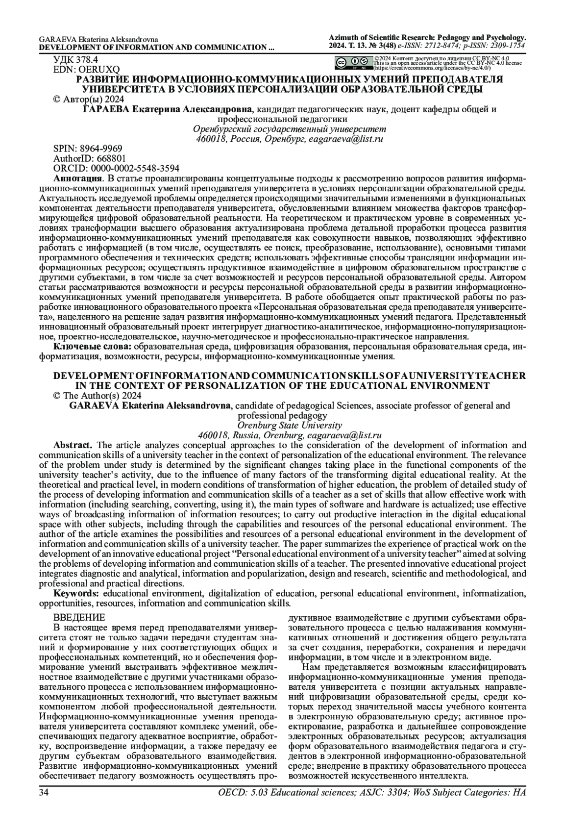 В статье проанализированы концептуальные подходы к рассмотрению вопросов развития информационно-коммуникационных умений преподавателя университета в условиях персонализации образовательной среды. Актуальность исследуемой проблемы определяется происходящими значительными изменениями в функциональных компонентах деятельности преподавателя университета, обусловленными влиянием множества факторов трансформирующейся цифровой образовательной реальности. На теоретическом и практическом уровне в современных условиях трансформации высшего образования актуализирована проблема детальной проработки процесса развития информационно-коммуникационных умений преподавателя как совокупности навыков, позволяющих эффективно работать с информацией (в том числе, осуществлять ее поиск, преобразование, использование), основными типами программного обеспечения и технических средств; использовать эффективные способы трансляции информации информационных ресурсов; осуществлять продуктивное взаимодействие в цифровом образовательном пространстве с другими субъектами, в том числе за счет возможностей и ресурсов персональной образовательной среды. Автором статьи рассматриваются возможности и ресурсы персональной образовательной среды в развитии информационно-коммуникационных умений преподавателя университета. В работе обобщается опыт практической работы по разработке инновационного образовательного проекта «Персональная образовательная среда преподавателя университета», нацеленного на решение задач развития информационно-коммуникационных умений педагога. Представленный инновационный образовательный проект интегрирует диагностико-аналитическое, информационно-популяризационное, проектно-исследовательское, научно-методическое и профессионально-практическое направления.