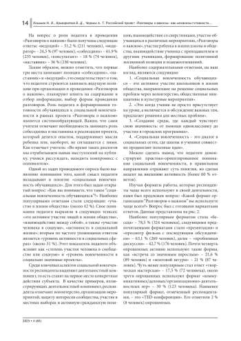 В статье представлено исследование, которое отражает результаты уже полученного практического опыта реализации проекта Минпросвещения России «Разговоры о важном», определены возможности влияния проекта на формирование готовности к социальной вовлеченности обучающихся. Важной частью исследования является изучение оценки методической обеспеченности этого процесса педагогами в различных регионах РФ, а также выявление трудностей при реализации проекта «Разговоры о важном» на современном этапе.