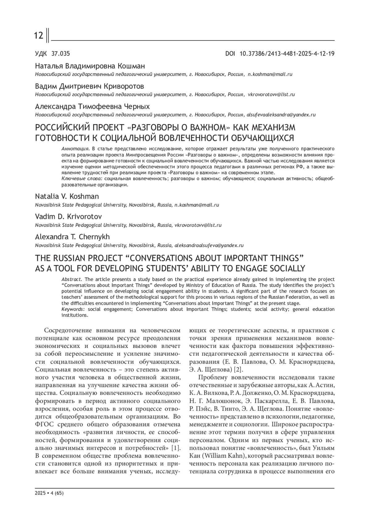 Сосредоточение внимания на человеческом потенциале как основном ресурсе преодоления экономических и социальных вызовов влечет за собой переосмысление и усиление значимости социальной вовлеченности обучающихся.