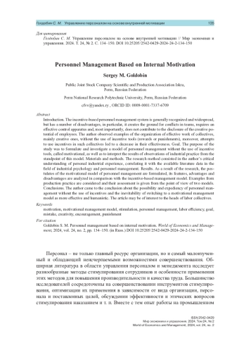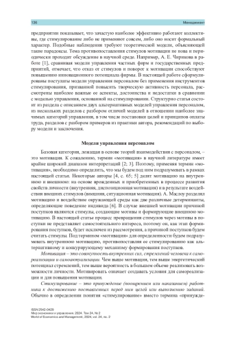Система управления персоналом, основанная на стимулировании, общепризнанна, широко распространена, но имеет ряд недостатков, в частности, создает почву для конфликтов в коллективах, требует результативного контрольного аппарата и, главное, не способствует раскрытию творческого потенциала работников. Автор наблюдал примеры организации эффективной работы коллективов, главным образом творческих, без использования инструментов стимулирования (поощрений или наказаний), более того, попытки применения в таких коллективах стимулирования приводили к снижению их эффективности. Целью исследования было сформулировать и исследовать модель управления персоналом без применения инструментов стимулирования, названную мотивационной, а также интерпретировать результаты наблюдений производственной практики с позиций этой модели. Метод исследования состоял в критическом осмыслении автором личного производственного опыта, соотнесении его с имеющимися литературными данными в области промышленной психологии и управления персоналом. В результате исследования сформулированы постулаты мотивационной модели управления персоналом, проанализированы ее особенности, достоинства и недостатки в сопоставлении с моделью управления на основе стимулирования. Рассмотрены примеры из производственной практики и дана их оценка с точки зрения двух моделей.