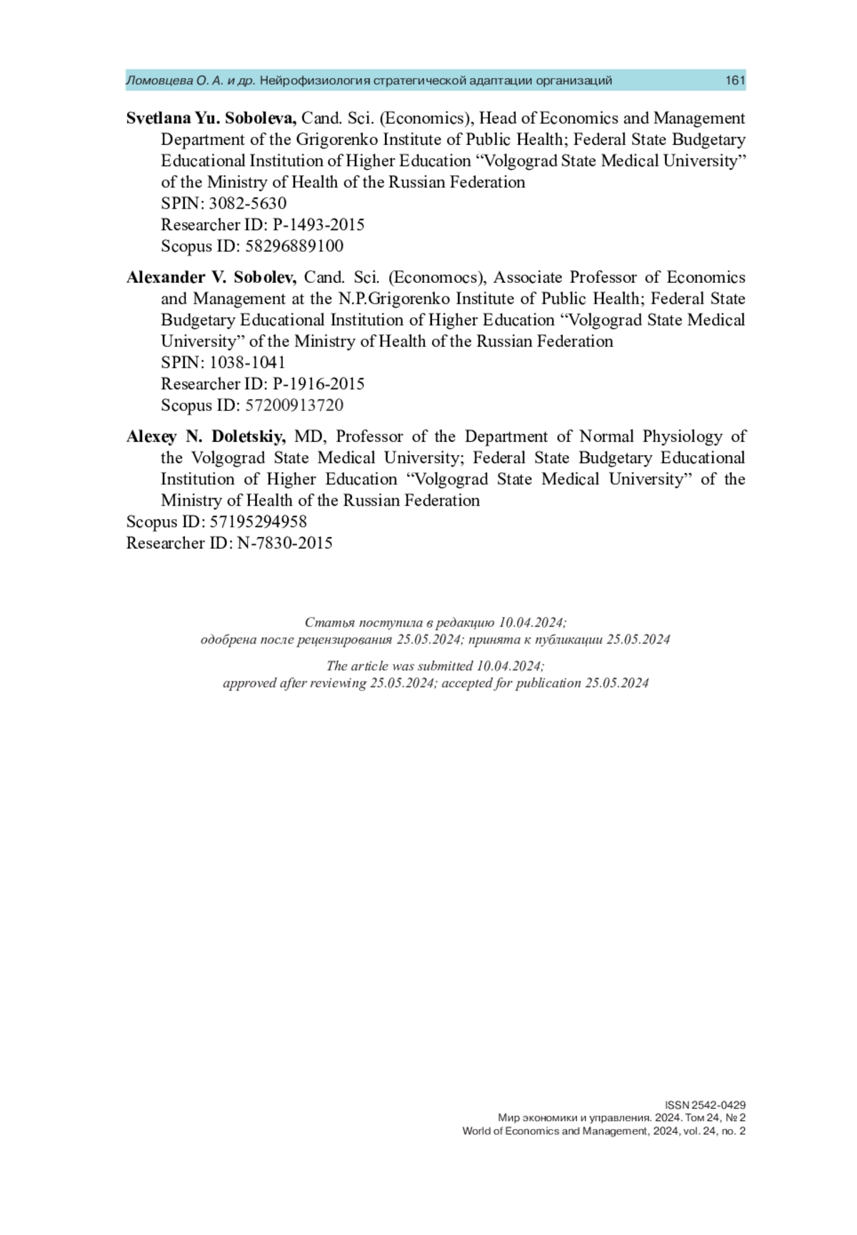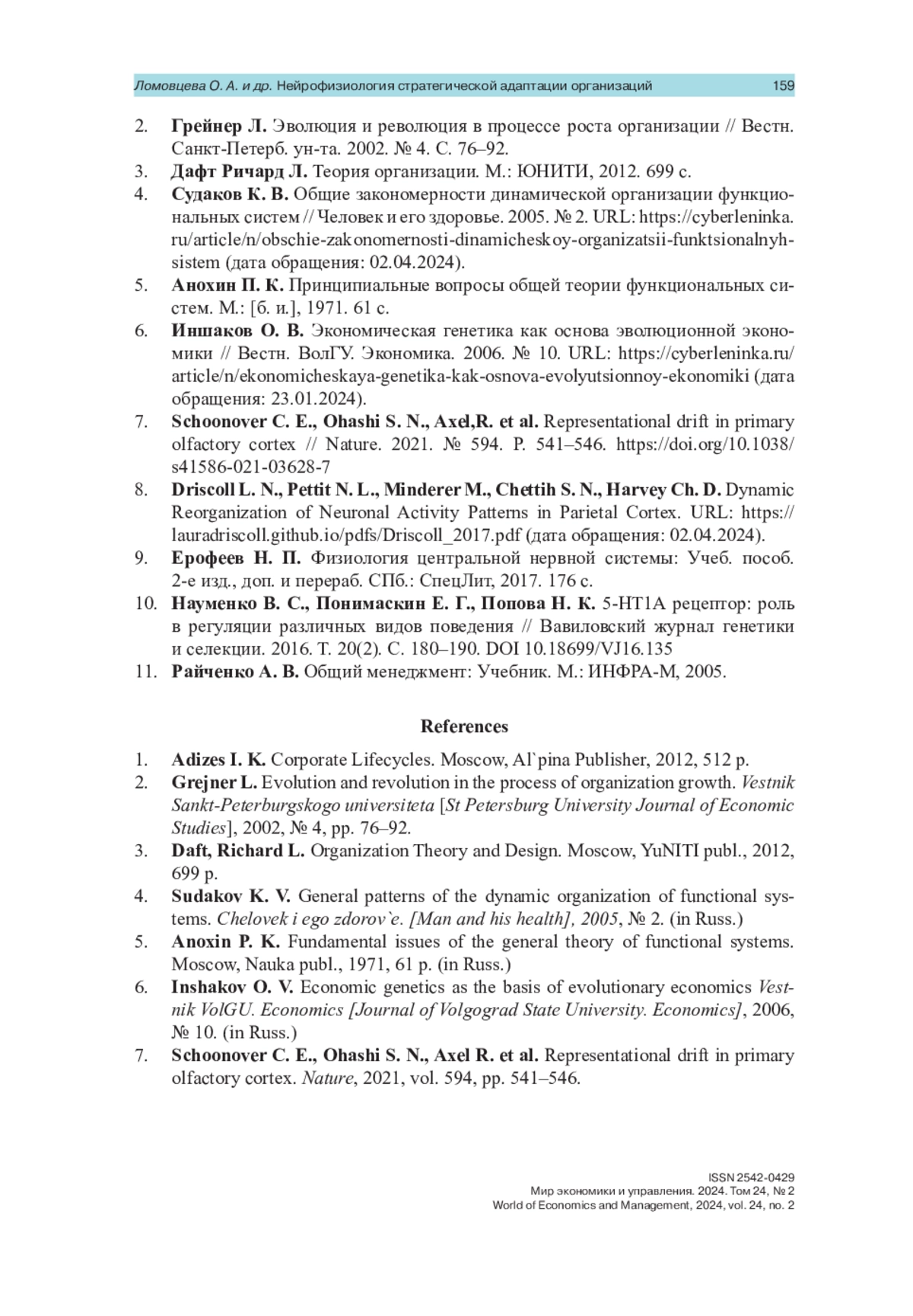 В работе исследуются сходства функционирования организации и человеческого организма, выявляются адаптационные биологические характеристики, которые проявляются также на уровне социальной структуры, описываются приспособленческие явления биологического порядка на клеточном уровне и проявления подобных на организационном. Цель исследования состоит в дополнении органического понимания сущности организаций нейрофизиологическими эффектами биологических систем. Представлена гипотеза о наличии казуальных связей между способностями стратегической гибкости организации к вызовам внешней среды и адаптивными свойствами нейрофизиологической природы, которая свойственна биологическим объектам. В исследовании применены общенаучные методы, такие как анализ, синтез, сравнение, сопоставление, экстраполяция, а также социально-экономический, исторический, биологический и нейрофизиологический подходы. Излагается новое понимание адаптационных свойств организации в условиях неопределенности внешней среды, ее быстрой изменчивости с точки зрения нейрофизиологии. Описаны такие клеточные эффекты, как спилловер, интернализация рецепторов и репрезентативный дрейф нейронов, которые проявляются на предприятии на уровне социальном и организационном. Представлены организационные проекции нейрофизиологических эффектов на социальном и организационном уровне по распространению информации, знаний, оптимизации организационных структур, непрерывном обновлении, ротации и смены структурных подразделений, участвующих в адаптационном процессе. Выявлено соответствие эффектов имманентным свойствам организации, таким как эмерджентность, ингрессивность и эгрессивность. Представлен обновленный тезаурус и семантика общего и стратегического менеджмента при рассмотрении организации с точки зрения организменного подхода. Показана результативность адаптационных возможностей менеджмента организации при проведении мероприятий по снижению вредных воздействий внешней среды на механизм устойчивого функционирования.