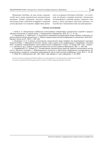1. Белик Е. В. Методические особенности использования интерактивных динамических моделей в процессе обучения математике в старшей школе // Информатика и образование. 2016. № 7. С. 41-44. EDN: WMCHID
