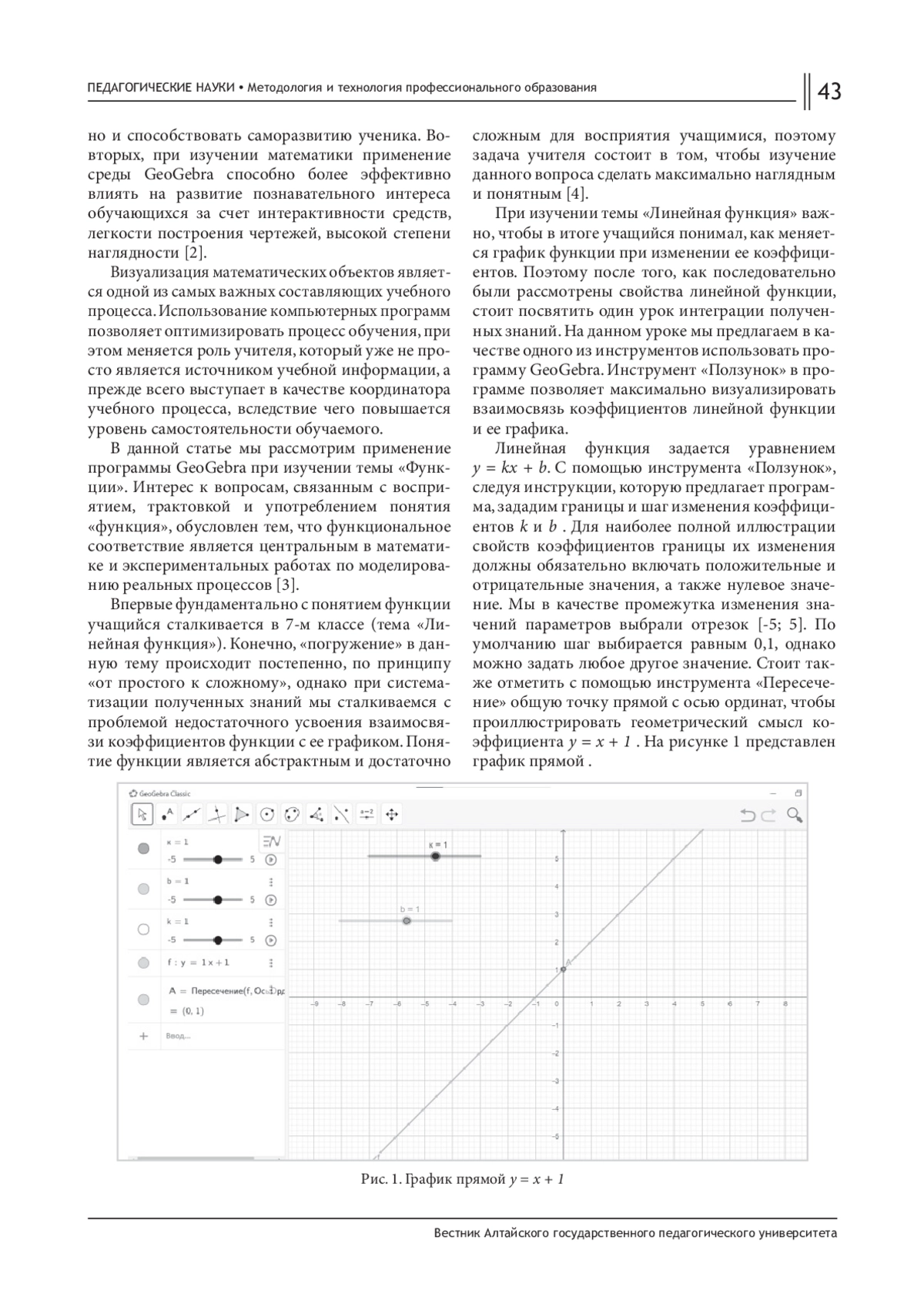 2. Чернышева Д. А., Кравченко Г. В. Возможности применения интерактивной среды GeoGebra в обучении студентов математическим дисциплинам // Сборник трудов всероссийской конференции по математике “МАК-2015”. Барнаул: Изд-во АлтГУ, 2015. С. 225-229. EDN: TYENYP