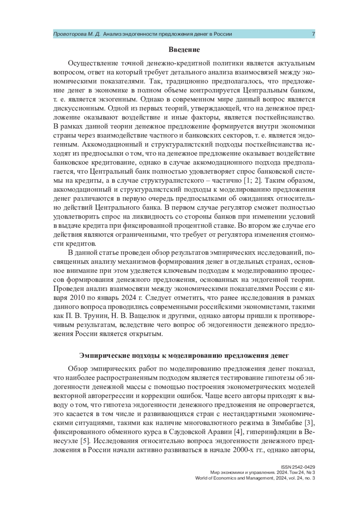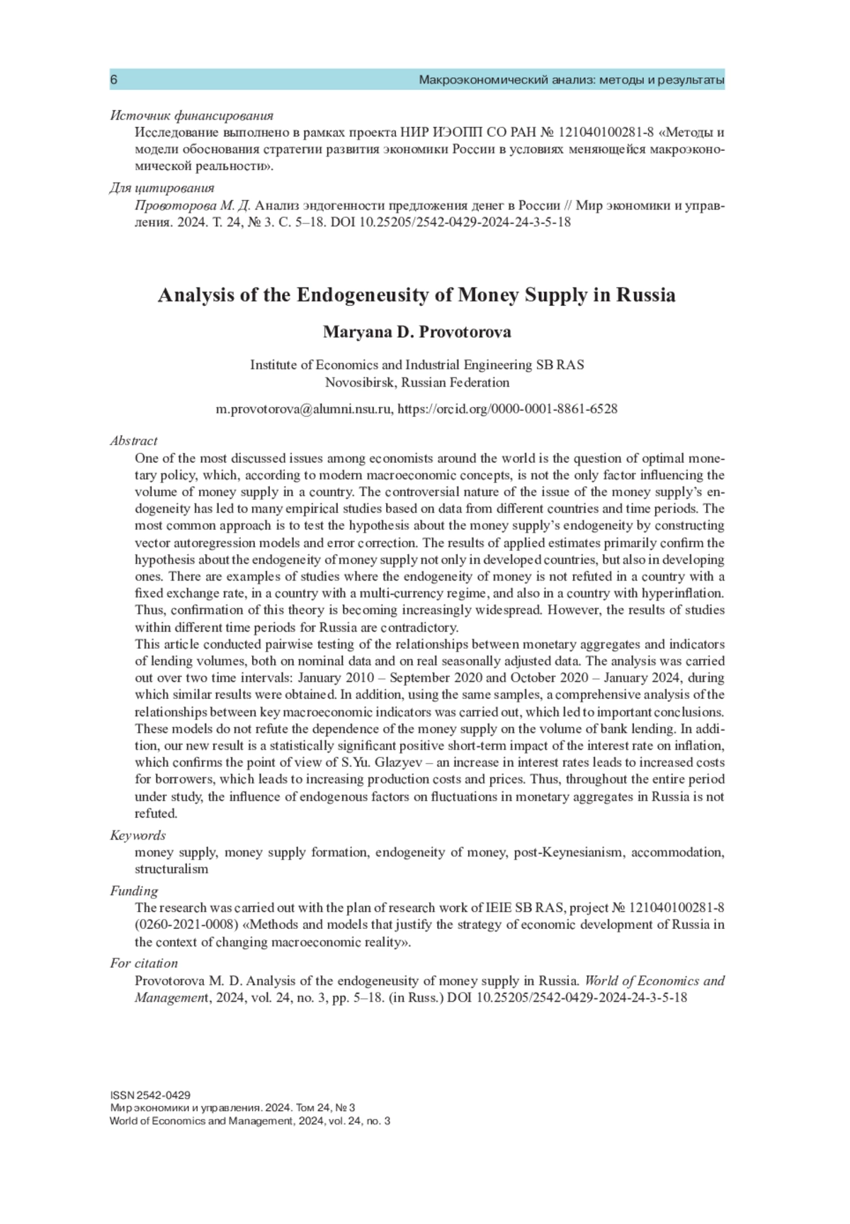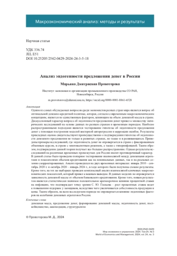 Одним из самых обсуждаемых вопросов среди экономистов разных стран мира является вопрос об оптимальной денежно-кредитной политике, которая, согласно современным макроэкономическим концепциям, является не единственным фактором, влияющим на объем денежной массы в стране. Дискуссионный характер вопроса об эндогенности предложения денег привел к множеству эмпирических исследований на основе данных по разным странам и временным периодам. Наиболее распространенными подходами является тестирование гипотезы об эндогенности предложения денег с помощью построения моделей векторной авторегрессии и коррекции ошибок. Результаты прикладных оценок свидетельствуют преимущественно о подтверждении гипотезы об эндогенности денежного предложения не только в развитых странах, но также и в развивающихся. Приведены примеры исследований, где эндогенность денег не опровергается в стране с фиксированным обменным курсом, в стране с многовалютным режимом, а также с гиперинфляцией. Таким образом, подтверждение данной теории получает все большее распространение. Однако, результаты исследований на различных временных промежутках для России имеют противоречивый характер. В данной статье было проведено попарное тестирование взаимосвязей между денежными агрегатами и показателями объемов кредитования как на номинальных данных, так и на реальных сезонно скорректированных. Анализ проводился на двух временных интервалах: январь 2010 – сентябрь 2020 гг. и октябрь 2020 – январь 2024 гг., в ходе которого были получены схожие результаты. Кроме того, на тех же выборках проведен комплексный анализ взаимосвязей ключевых макроэкономических показателей, который привел к важным выводам. В данных моделях не опровергается зависимость денежной массы от объемов банковского кредитования. Кроме того, новым результатом является статистически значимое положительное краткосрочное влияние процентной ставки на инфляцию, что подтверждает точку зрения С. Ю. Глазьева – рост процентных ставок ведет к повышению издержек у заемщиков, вследствие чего увеличивается себестоимость продукции и цены. Таким образом, на всем исследуемом периоде не опровергается влияние эндогенных факторов на колебания денежных агрегатов в России.
