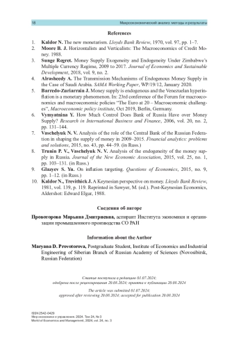 6. Vymyatnina Y. How Much Control Does Bank of Russia Have over Money Supply? // Research in International Business and Finance. 2006. Vol. 20. No. 2. P. 131-144.