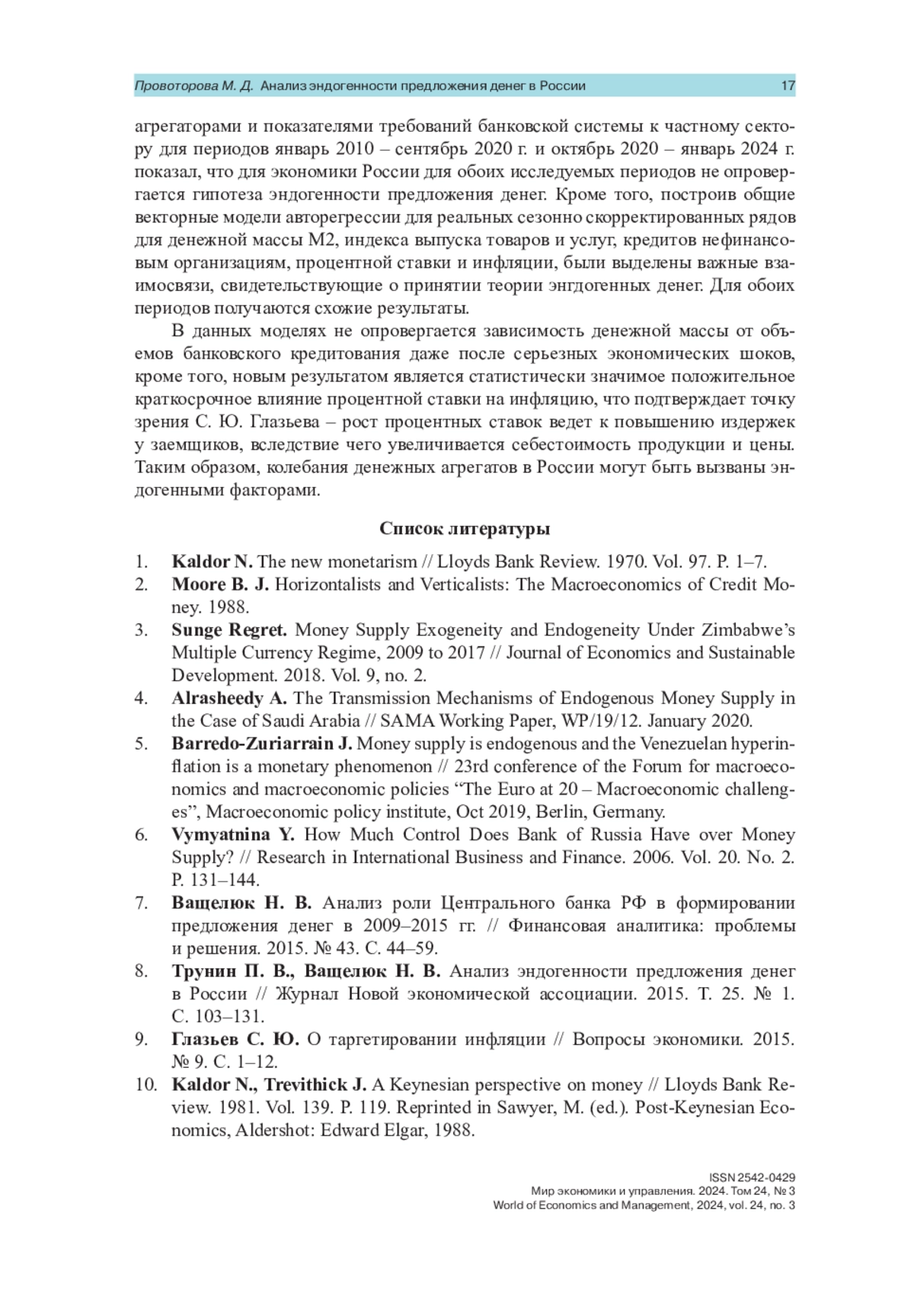 10. Kaldor N., Trevithick J. A Keynesian perspective on money // Lloyds Bank Review. 1981. Vol. 139. P. 119. Reprinted in Sawyer, M. (ed.). Post-Keynesian Economics, Aldershot: Edward Elgar, 1988.