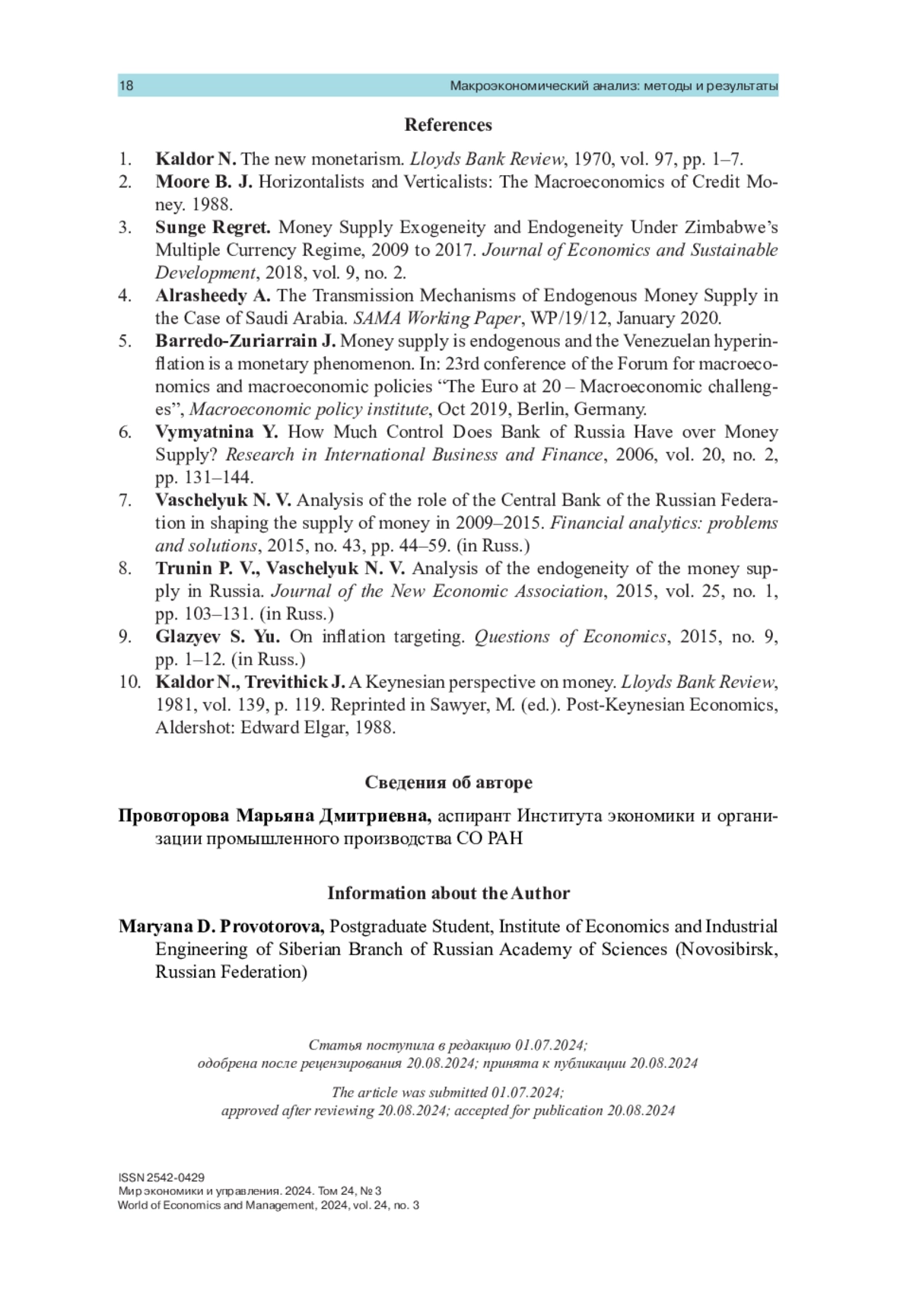 8. Трунин П. В., Ващелюк Н. В. Анализ эндогенности предложения денег в России // Журнал Новой экономической ассоциации. 2015. Т. 25. № 1. С. 103-131.