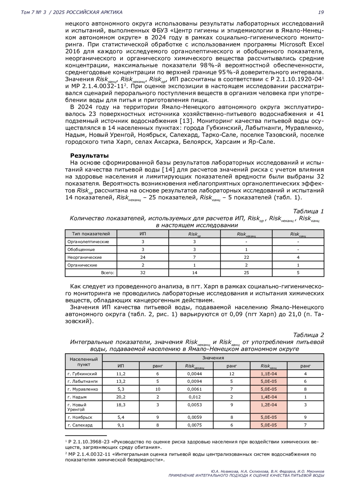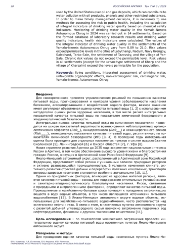 Новая стратегии развития Арктики до 2035 года закрепляет национальные интересы России в Арктике, в том числе обеспечение высокого уровня жизни и благосостояния граждан России, живущих в Арктической зоне Российской Федерации. Ямало-Ненецкий автономный округ представляет собой регион с уникальным запасом природных ресурсов и активно развивающейся промышленностью. Водные объекты, используемые для хозяйственно-питьевого водоснабжения населения округа, часто располагаются над залеганиями нефти и газа, что может оказывать влияние на загрязнение вод нефтепродуктами, фенолами и другими токсичными веществами. Для своевременного принятия управленческих решений необходимо использование методологии оценки риска здоровью населения, в том числе расчет интегральных показателей качества питьевой воды по показателям химической безвредности. Мониторинг качества питьевой воды в Ямало-Ненецком автономном округе в 2024 году осуществлялся в 14 населенных пунктах. На основе сформированной базы результатов лабораторных исследований и испытаний качества питьевой воды были рассчитаны показатели риска здоровью. Значения интегрального показателя качества (ИП) питьевой воды населенных пунктов Ямало-Ненецкого автономного округа варьируются от 0,09 до 21,0. Значения риска (Riskор) превышают приемлемые уровни в питьевой воде в городах Лабытнанги, Надым, Новый Уренгой, Салехард, ТаркоСале, поселке Тазовский, селе Яр-Сале. Значения хронического Riskнеканц не превышают приемлемый уровень. Значения Riskканц во всех населенных пунктах (за исключением пгт. Харп и с. Харсаим) превышают приемлемые для населения уровни.
