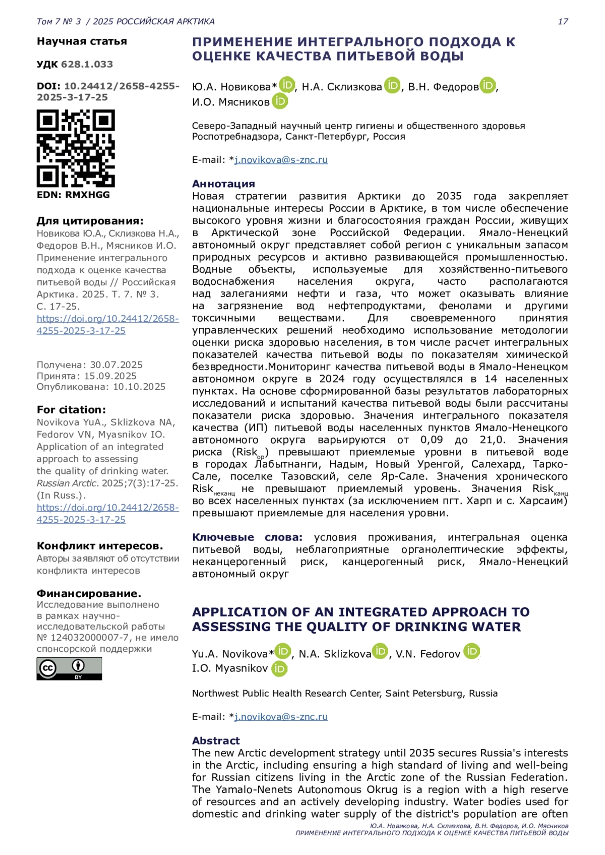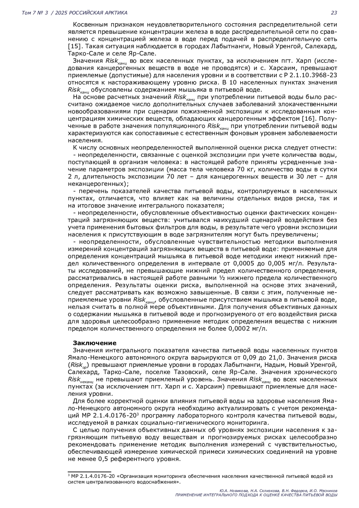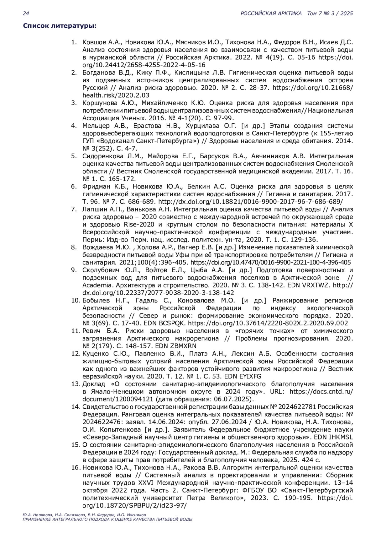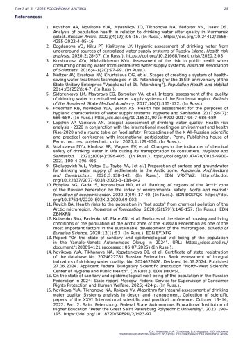 1. Ковшов А.А., Новикова Ю.А., Мясников И.О., Тихонова Н.А., Федоров В.Н., Исаев Д.С. Анализ состояния здоровья населения во взаимосвязи с качеством питьевой воды в мурманской области // Российская Арктика. 2022. № 4(19). С. 05-16. DOI: 10.24412/2658-4255-2022-4-05-16