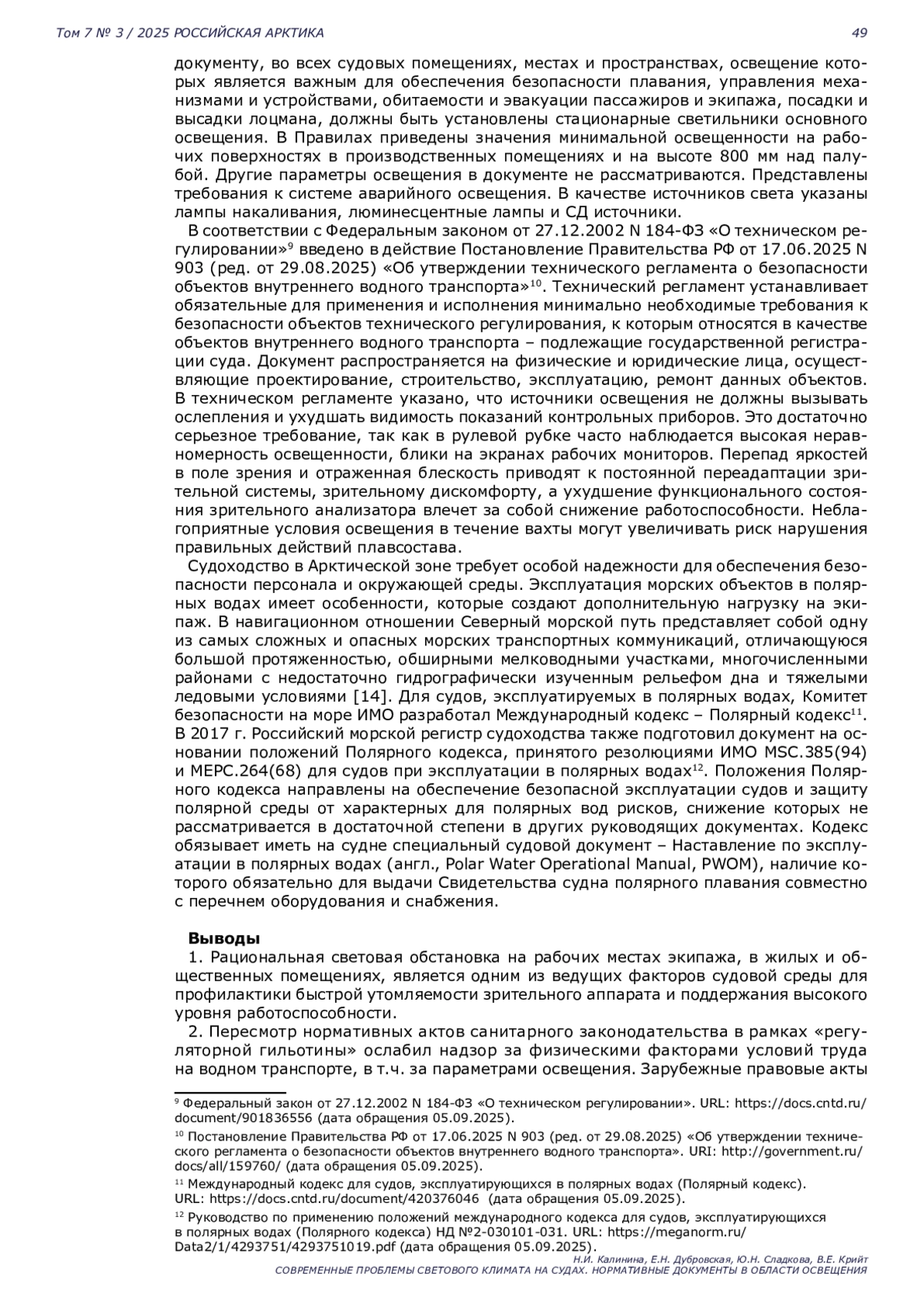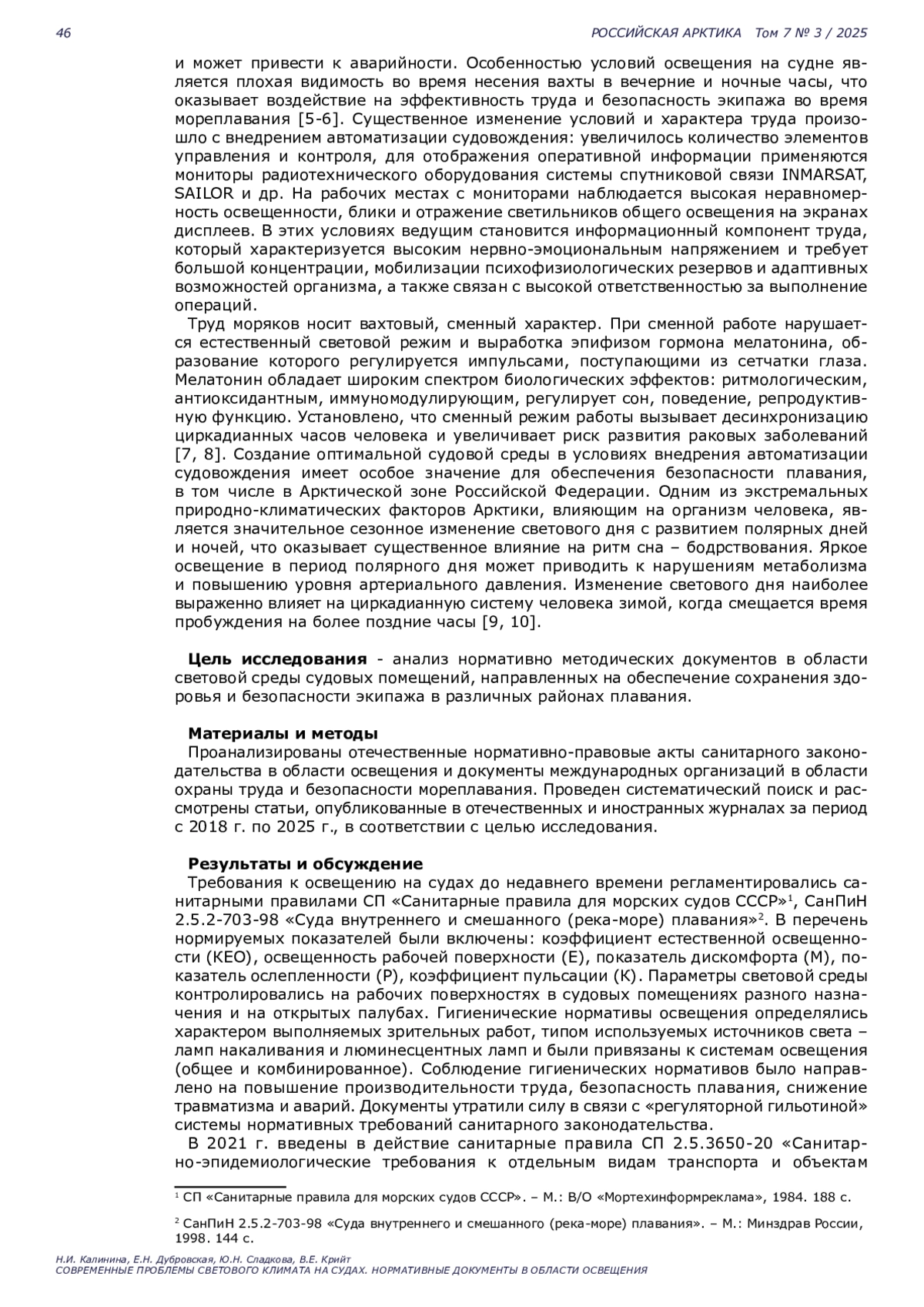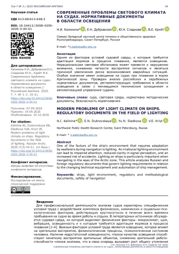 14. Разлетова А.Б., Никитина В.Н., Ляшко Г.Г., Калинина Н.И., Дубровская Е.Н., Котенко П.К. Гигиеническая оценка особенностей трудовой деятельности экипажа в условиях Арктики и нормативное обеспечение охраны здоровья моряков: проспективное исследование // Морская медицина. 2022. Т. 8. № 3. С. 88-99.