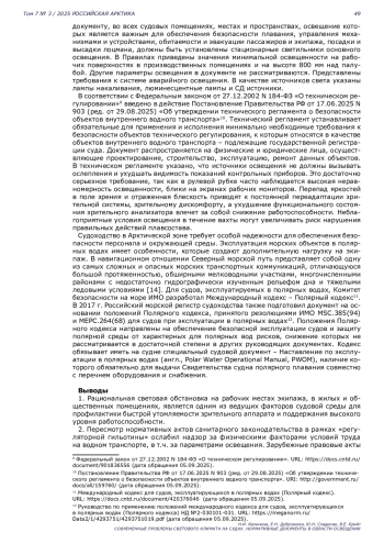 Одним из факторов условий судовой среды, к которым требуется адаптация моряков в процессе плавания, является освещение. Нерациональная световая обстановка может привести к нарушению внимания, снижению четкости восприятия сигналов и являться причиной увеличения риска возникновения аварийных ситуаций. Особое значение имеет освещение на судах при плавании в морях Арктической зоны. Проведен анализ российских и зарубежных нормативных документов, регламентирующих требования в области освещения в связи с меняющимся техническим оснащением и автоматизацией управления судами.