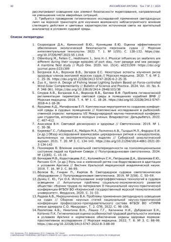 5. Смуров А.В., Богданов А.А., Воронов В.В., Беляев В.Ф. Проблема гигиенической регламентации параметров световой среды в помещениях кораблей ВМФ // Морская медицина. 2018. Т. 4. № 1. С. 18-26. DOI: 10.22328/2413-5747-2018-4-1-18-26