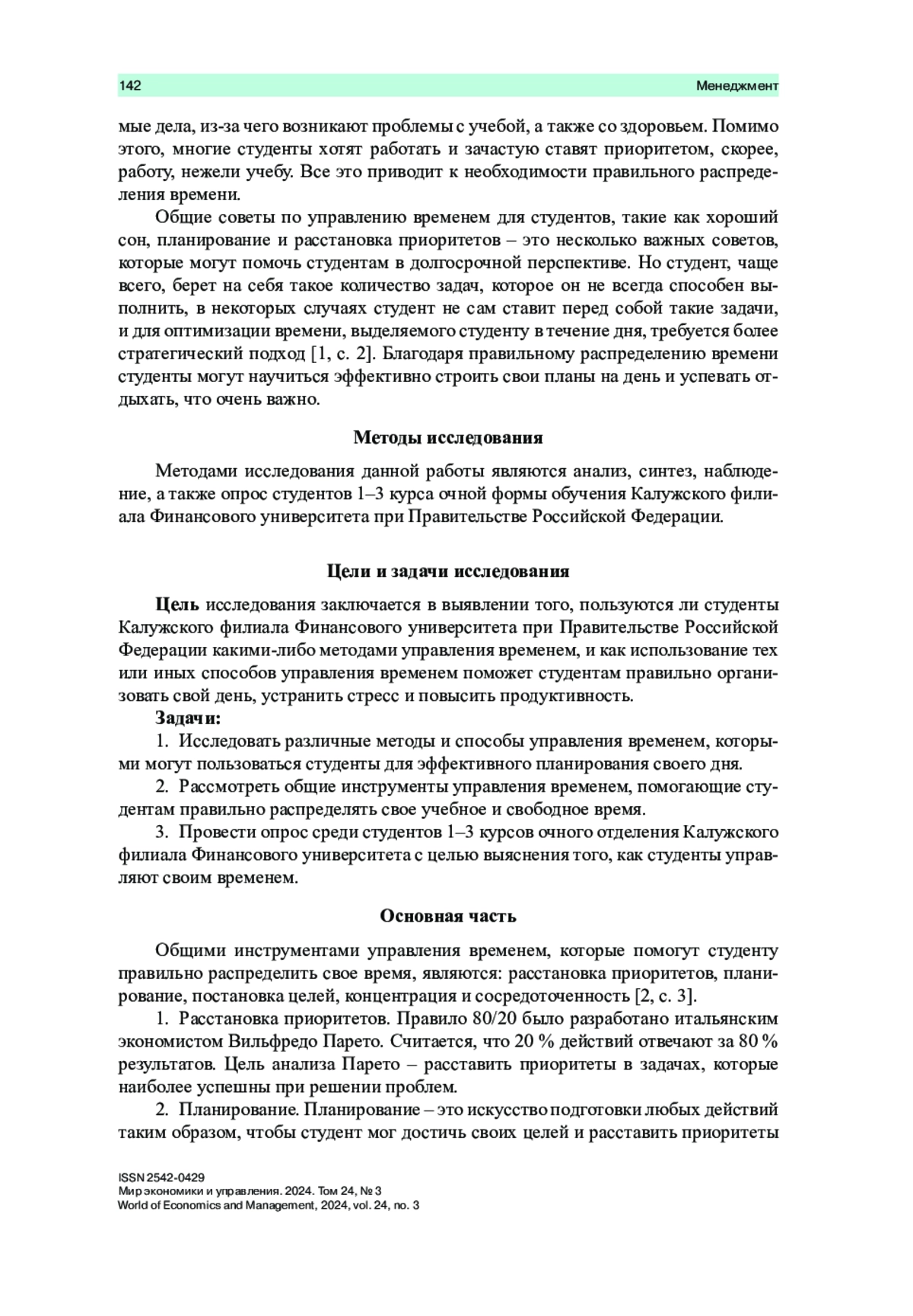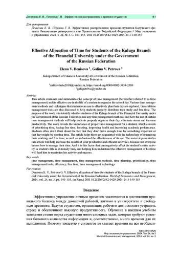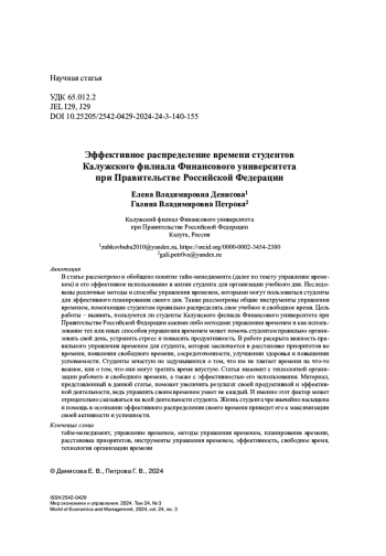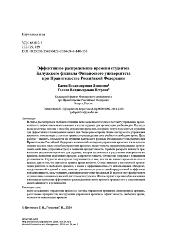 В статье рассмотрено и обобщено понятие тайм-менеджмента (далее по тексту управление временем) и его эффективное использование в жизни студента для организации учебного дня. Исследованы различные методы и способы управления временем, которыми могут пользоваться студенты для эффективного планирования своего дня. Также рассмотрены общие инструменты управления временем, помогающие студентам правильно распределять свое учебное и свободное время. Цель работы − выявить, пользуются ли студенты Калужского филиала Финансового университета при Правительстве Российской Федерации какими-либо методами управления временем и как использование тех или иных способов управления временем может помочь студентам правильно организовать свой день, устранить стресс и повысить продуктивность. В работе раскрыта важность правильного управления временем для студента, которая заключается в расстановке приоритетов во времени, появлении свободного времени, сосредоточенности, улучшении здоровья и повышении успеваемости. Студенты зачастую не задумываются о том, что им не хватает времени на что-то важное, или о том, что они могут тратить время впустую. Статья знакомит с технологией организации рабочего и свободного времени, а также с эффективностью его использования. Материал, представленный в данной статье, поможет увеличить результат своей продуктивной и эффективной деятельности, ведь управлять своим временем умеет не каждый. И именно этот фактор может отрицательно сказываться на всей деятельности студента. Жизнь студента чрезвычайно насыщена и помощь в осознании эффективного распределения своего времени приведет его к максимизации своей активности и успешности.