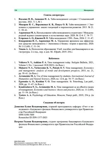 1. Волкова Н. В., Аникина П. А. Тайм-менеджмент сегодня // Столыпинский вестник. 2021. Т. 3, № 1.