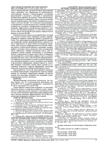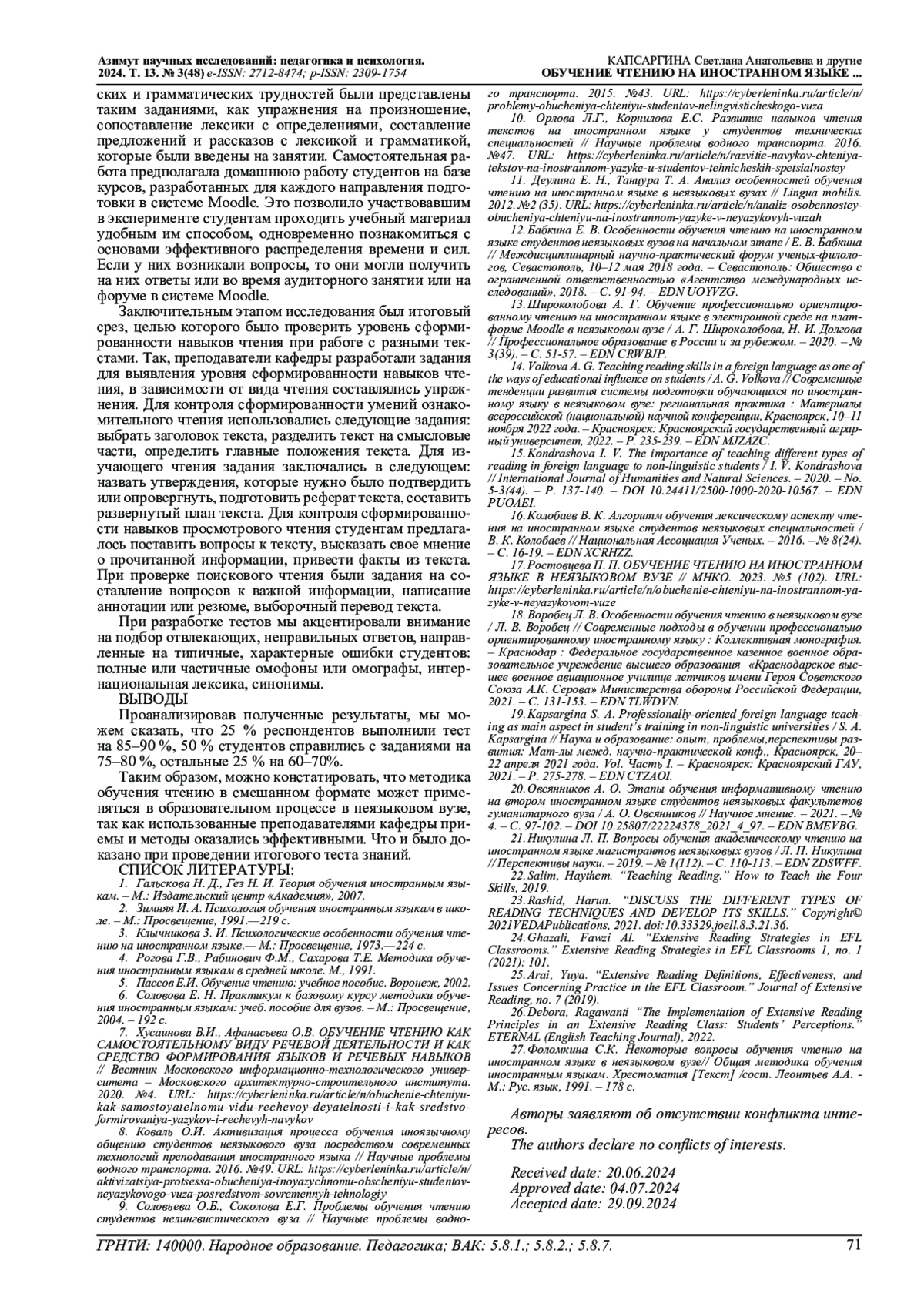 15. Kondrashova, I. V. The importance of teaching different types of reading in foreign language to non-linguistic students / I. V. Kondrashova // International Journal of Humanities and Natural Sciences. - 2020. - No. 5-3(44). - P. 137-140. DOI: 10.24411/2500-1000-2020-10567 EDN: PUOAEI