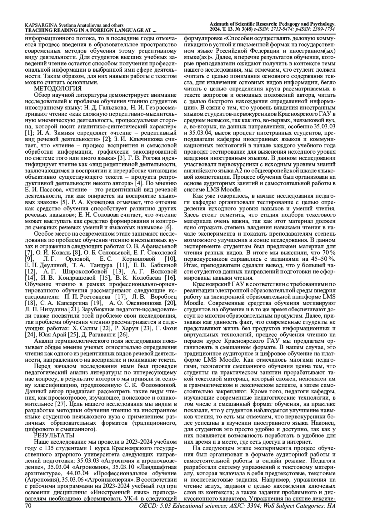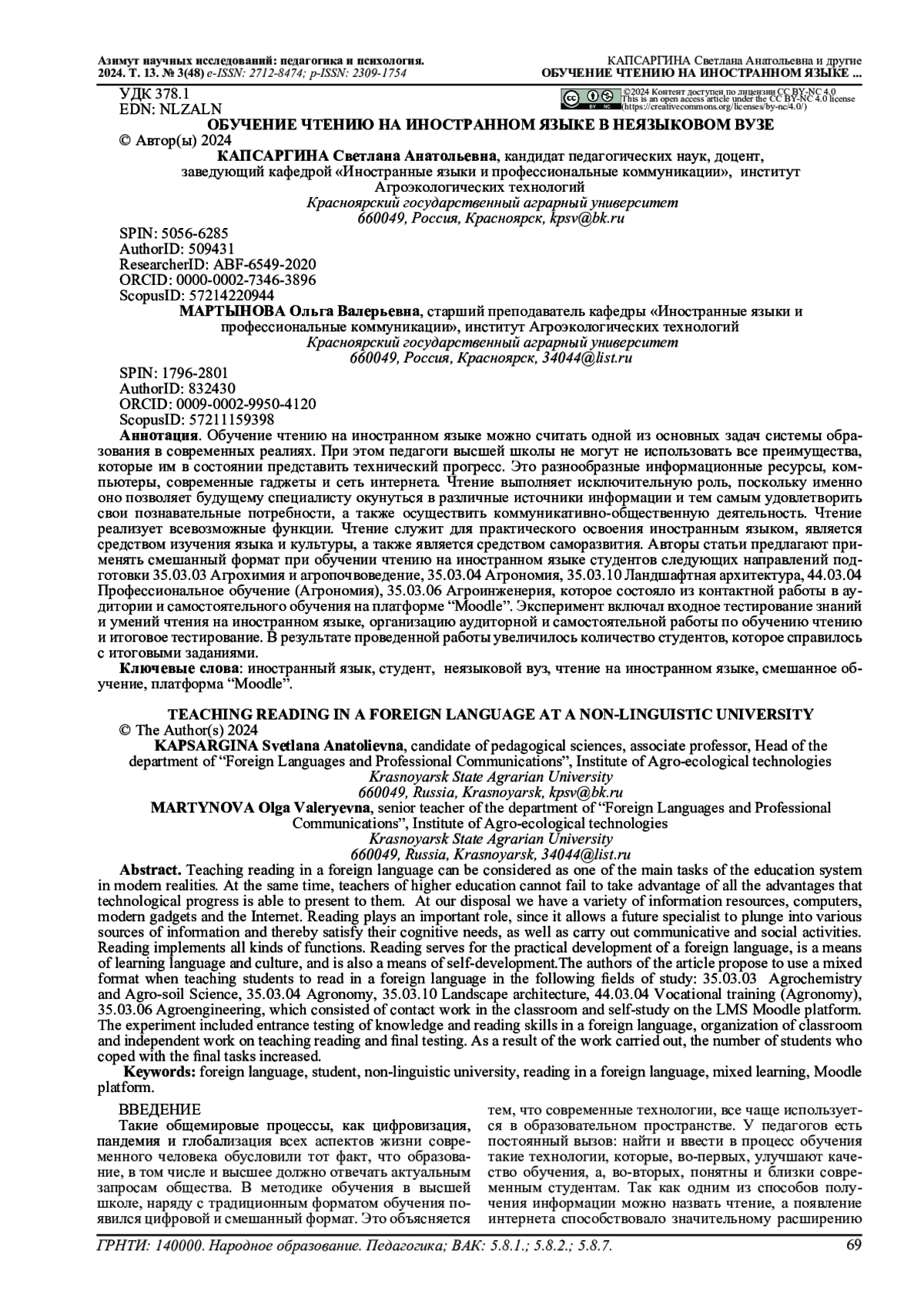 19. Kapsargina, S. A. Professionally-oriented foreign language teaching as main aspect in student’s training in non-linguistic universities / S. A. Kapsargina // Наука и образование: опыт, проблемы,перспективы развития: Мат-лы межд. научно-практической конф., Красноярск, 20-22 апреля 2021 года. Vol. Часть I. - Красноярск: Красноярский ГАУ, 2021. - P. 275-278. EDN: CTZAOI
