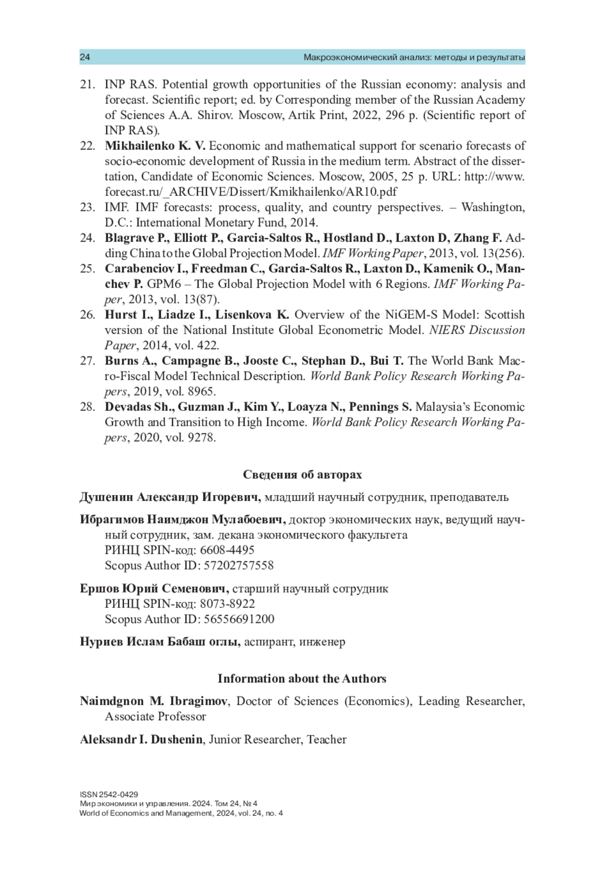 25. Carabenciov I., Freedman C., Garcia-Saltos R., Laxton D., Kamenik O., Manchev P. GPM6 - The Global Projection Model with 6 Regions II IMF Working Paper. 2013. Vol. 13 (87).