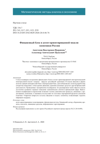 Статья посвящена построению финансового блока в агент-ориентированной многорегиональной межотраслевой модели «затраты - выпуск» российской экономики. В модель введены в форме агентов единый коммерческий банк и Центральный банк. Для небанковских агентов разработаны алгоритмы поведения с точки зрения движения, хранения денежных средств и другой финансовой деятельности. Проведенные эксперименты подтвердили, что расширенная таким образом модель достаточно адекватно отражает поведение экономических агентов в финансовой сфере. Выполненная модификация в перспективе позволяет изучать динамические процессы, связанные с кредитованием экономики, и оценивать последствия тех или иных мероприятий кредитно-денежной политики. Открытым вопросом осталось введение в модель элементов, позволяющих отразить инфляцию издержек.