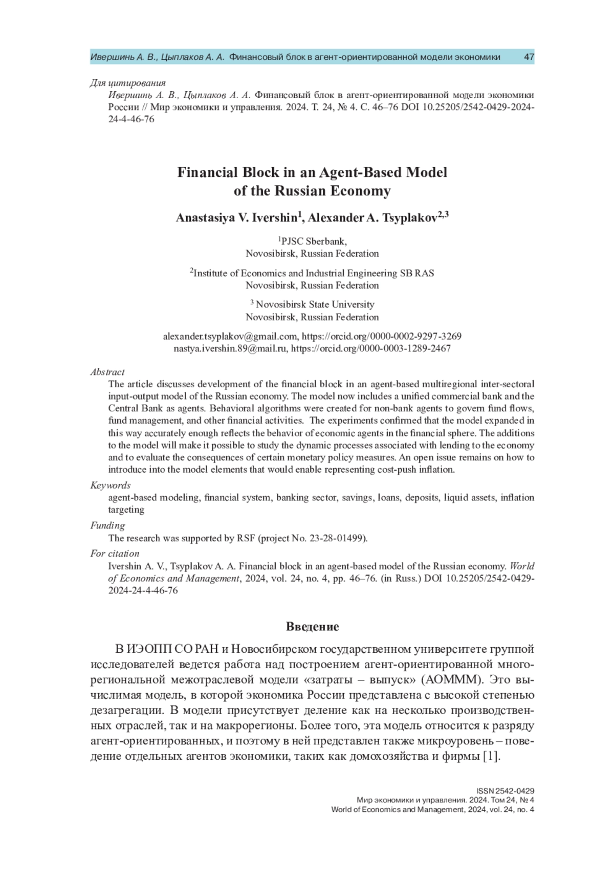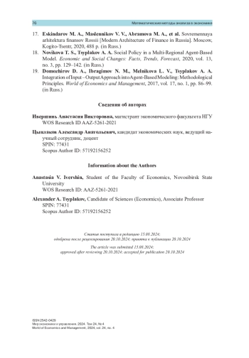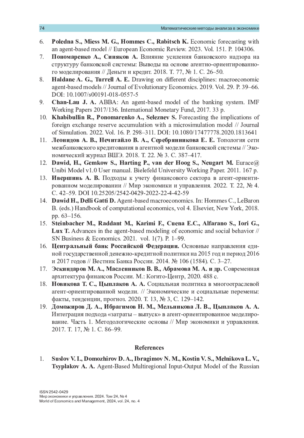 1. Суслов В. И., Доможиров Д. А., Ибрагимов Н. М., Костин В. С., Мельникова Л. В., Цыплаков А. А. Агент-ориентированная многорегиональная модель «затраты - выпуск» российской экономики // Экономика и математические методы. 2016. Т. 52, №1.С. 112-131.