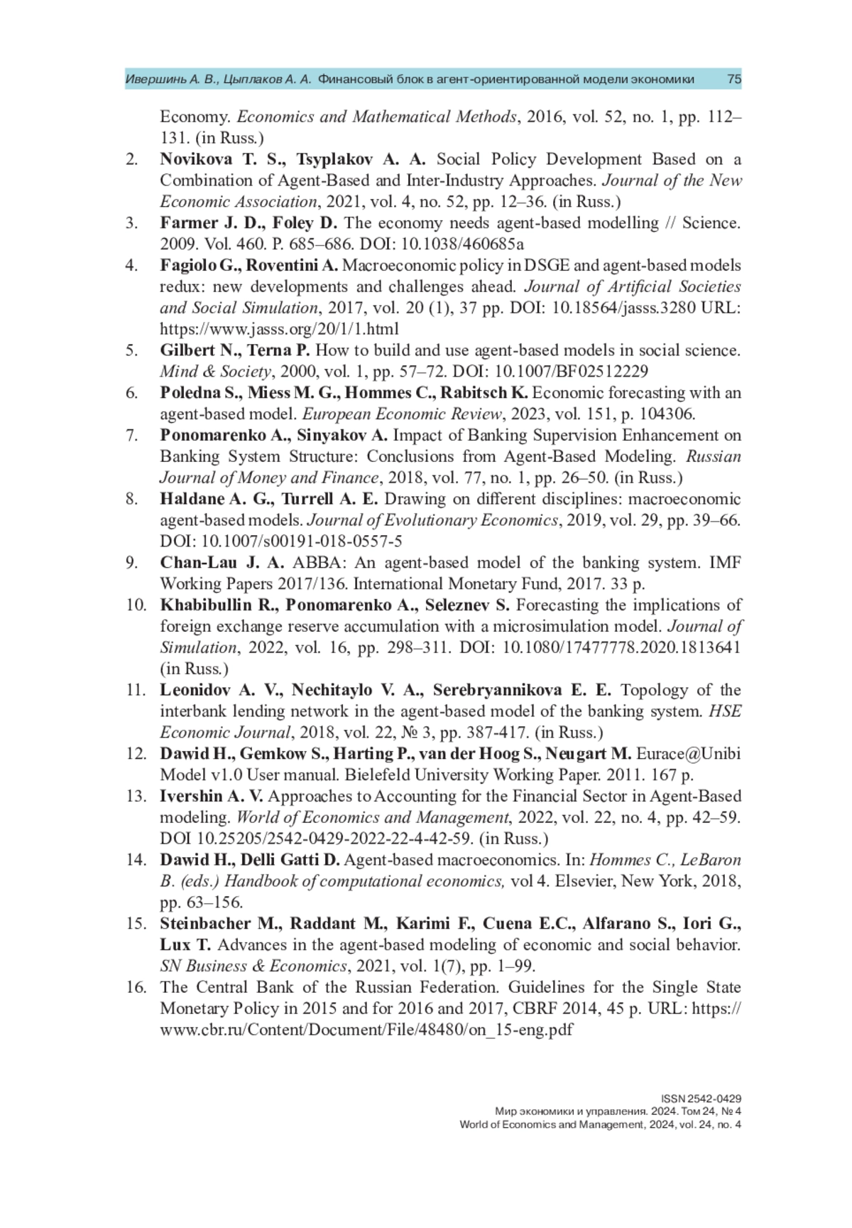 13. Пвершинь А. В. Подходы к учету финансового сектора в агент-ориентированном моделировании II Мир экономики и управления. 2022. Т. 22, № 4. С. 42-59. https://doi.org/10.25205/2542-0429-2022-22-4-42-59