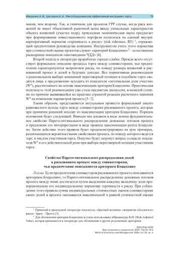 В работе представлен анализ торга между соинвесторами проекта с ярко выраженным вероятностным исходом, когда предпочтения участников торга описываются критерием Коццолино, что является актуальным, например, при долевом финансировании геологоразведочных работ на нефть и газ. Показано, что любое эффективное по Парето распределение вероятностных денежных потоков достигается путем их раздела пропорционально индивидуальным значениям параметра «терпимость к риску», причем выход на Парето-границу соответствует максимизации некоторой синергетической денежной оценки проекта, которую предлагается назвать «рентой Коццолино». Торг между рациональными инвесторами, выявляющий различия в их переговорной силе, происходит лишь по поводу перераспределения этой суммарной ренты с помощью паушальных платежей. Правило максимизации ренты Коццолино может быть использовано при анализе торга по поводу долевого финансирования проектов любой степени сложности - от мероприятий с простым бинарным исходом до комплексных предприятий, подразумевающих управление несколькими взаимосвязанными рискованными активами как реальными опционами.
