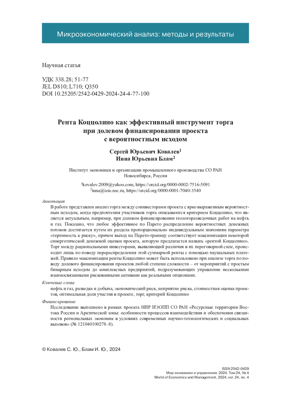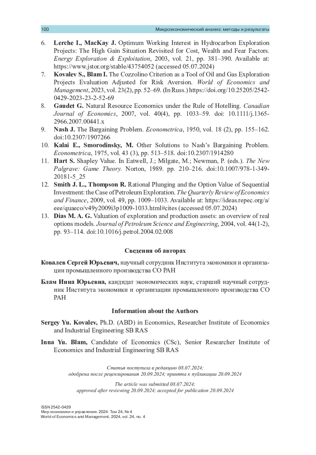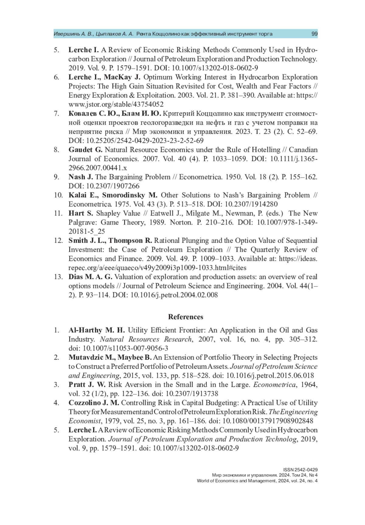 7. Ковалев С. Ю., Блам И. Ю. Критерий Коццолино как инструмент стоимостной оценки проектов геологоразведки на нефть и газ с учетом поправки на неприятие риска // Мир экономики и управления. 2023. Т. 23 (2). С. 52-69. https://doi.org/10.25205/2542-0429-2023-23-2-52-69