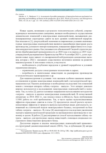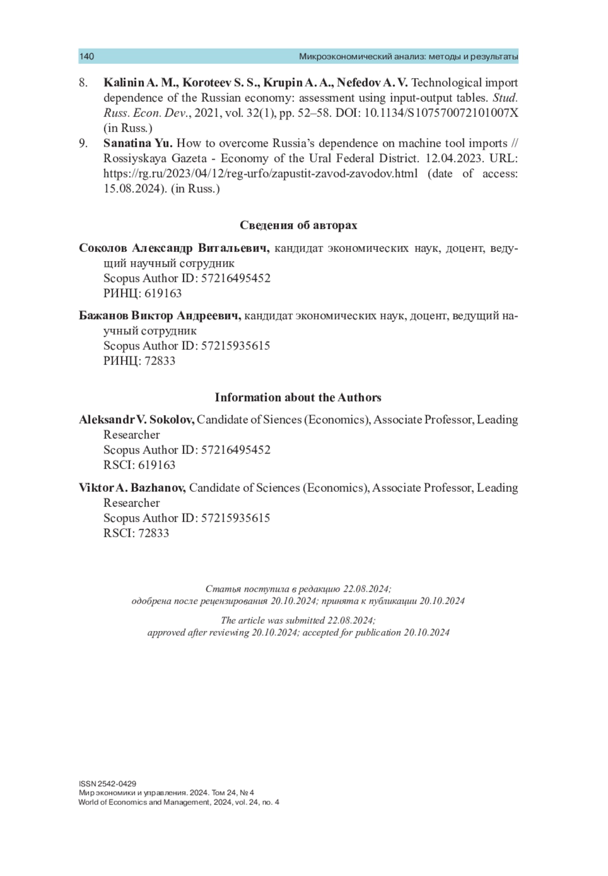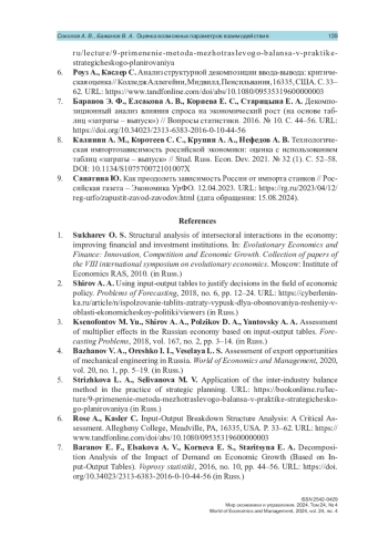 8. Калинин А. М., Коротеев С. С., Крупны А. А., Нефедов А. В. Технологическая импортозависимость российской экономики: оценка с использованием таблиц «затраты - выпуск» II Stud. Russ. Econ. Dev. 2021. № 32 (1). С. 52-58. https://doi.org/10.1134/S107570072101007X