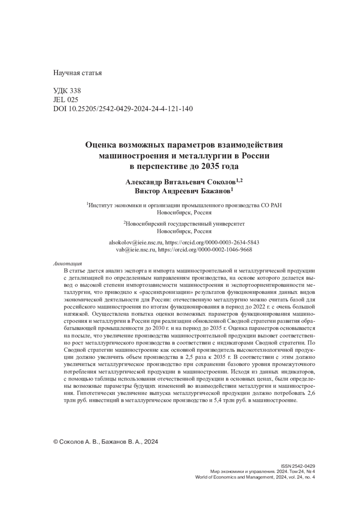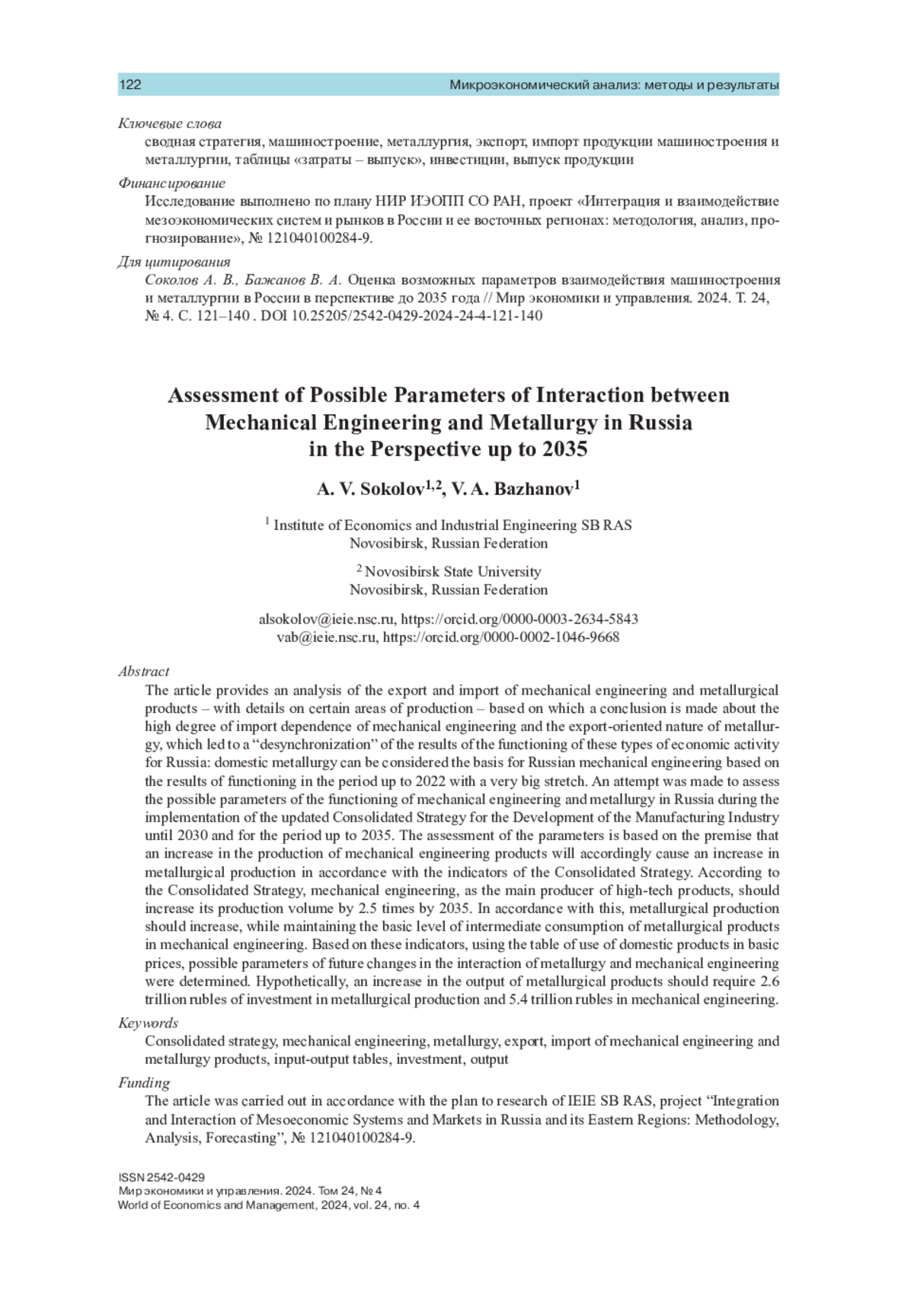В статье дается анализ экспорта и импорта машиностроительной и металлургической продукции с детализацией по определенным направлениям производства, на основе которого делается вывод о высокой степени импортозависмости машиностроения и экспортоориентированности металлургии, что приводило к «рассинхронизации» результатов функционирования данных видов экономической деятельности для России: отечественную металлургию можно считать базой для российского машиностроения по итогам функционирования в период до 2022 г. с очень большой натяжкой. Осуществлена попытка оценки возможных параметров функционирования машиностроения и металлургии в России при реализации обновленной Сводной стратегии развития обрабатывающей промышленности до 2030 г. и на период до 2035 г. Оценка параметров основывается на посыле, что увеличение производства машиностроительной продукции вызовет соответственно рост металлургического производства в соответствии с индикаторами Сводной стратегии. По Сводной стратегии машиностроение как основной производитель высокотехнологичной продукции должно увеличить объем производства в 2,5 раза к 2035 г. В соответствии с этим должно увеличиться металлургическое производство при сохранении базового уровня промежуточного потребления металлургической продукции в машиностроении. Исходя из данных индикаторов, с помощью таблицы использования отечественной продукции в основных ценах, были определены возможные параметры будущих изменений во взаимодействии металлургии и машиностроения. Гипотетически увеличение выпуска металлургической продукции должно потребовать 2,6 трлн руб. инвестиций в металлургическое производство и 5,4 трлн руб. в машиностроение.
