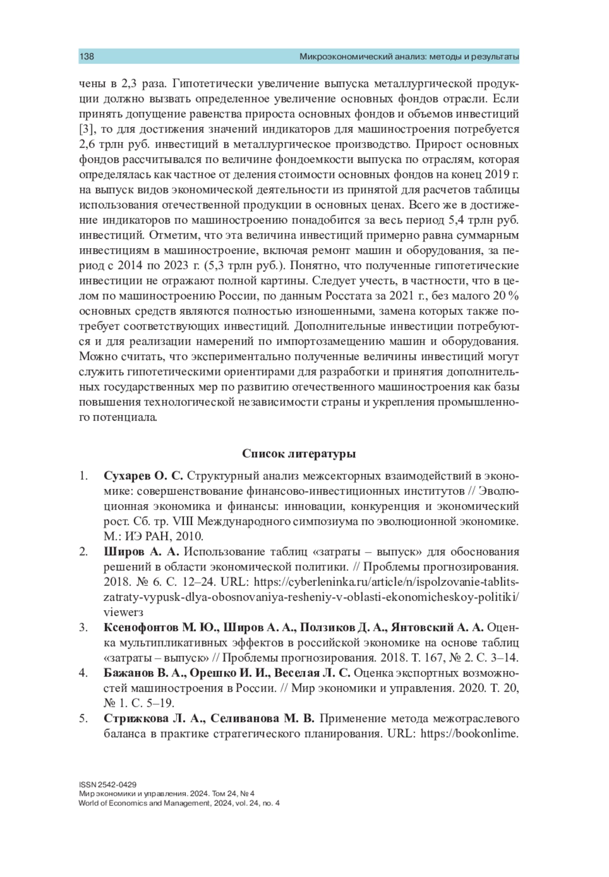 3. Ксенофонтов M. Ю., Широв А. А., Ползиков Д. А., Янтовский А. А. Оценка мультипликативных эффектов в российской экономике на основе таблиц «затраты - выпуск» // Проблемы прогнозирования. 2018. Т. 167, № 2. С. 3-14.
