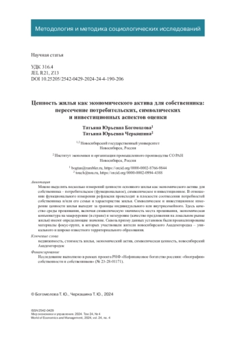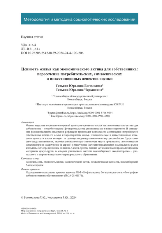 Можно выделить несколько измерений ценности основного жилья как экономического актива для собственника - потребительское (функциональное), символическое и инвестиционное. В отношении функционального измерения рефлексия происходит в плоскости соотнесения потребностей собственника и/или его семьи и характеристик жилья. Символическое и инвестиционное измерение ценности жилья выходит за границы индивидуального или внутрисемейного. Здесь качество среды проживания, включая символическую значимость места проживания, экономическая конъюнктура на макроуровне (в стране) и мезоуровне (качество предложения на локальном рынке жилья) имеют определяющие значение. Сквозь призму данных установок были проанализированы материалы фокус-групп, в которых участвовали жители новосибирского Академгородка - уникального и широко известного территориального образования.
